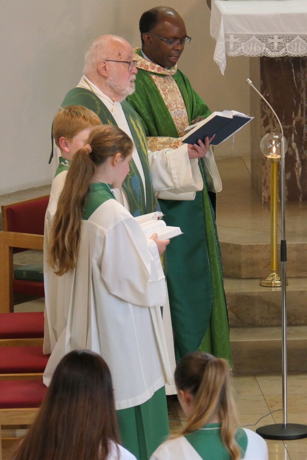 Noch vor der Predigt des Gastes aus dem Kongo stellten zwei Ministrantinnen vor, in welchen Situationen sie den Glauben in ganz besonderer Weise erlebten; wie etwa beim Blutritt in Weingarten, bei dem Ellen Liebrich schon als Ministrantin dabei und war und mittlerweile auch als junge Frau mitgeritten ist. Für die musikalische Begleitung des Gesangs im Gottesdienst spielte Gabi Detzel die Orgel, wobei sie für einige Lieder durch eine sehr spontan von Pfarrer Schuhmacher einberufene Bläsercombo von Ministrantinnen und Ministranten unterstützt wurde.