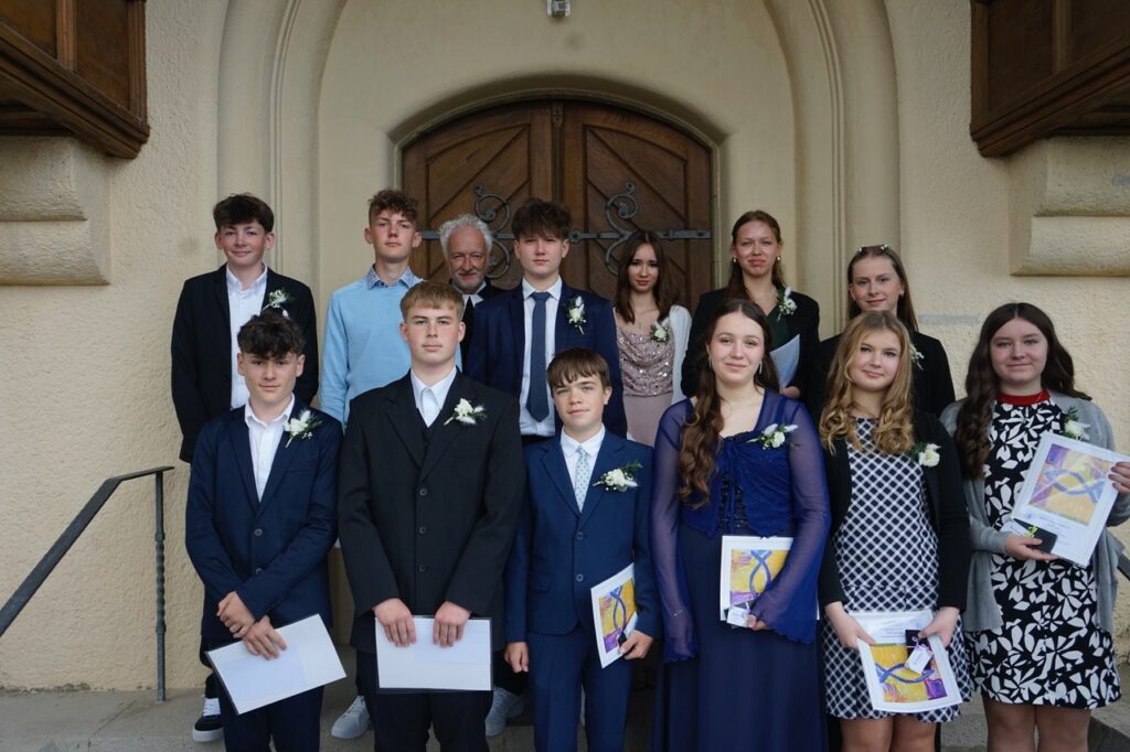 Auch am darauffolgenden Sonntag, den 18. Mai, hieß es „Herzlich Willkommen zur Konfirmation“. 12 weitere Jugendliche bekräftigten an diesem Tag im Kreise ihrer Familien und Freunde sowie der anwesenden Gemeinde ihren christlichen Glauben. Der Konfirmationsgottesdienst, geleitet von Pfarrer Bertl, stand unter dem Motto „Weg des Lebens“. So symbolisierte schon der feierliche Einzug der Konfirmandinnen und Konfirmanden durch den Haupteingang der Kirche und die vollbesetzten Sitzreihen, begleitet von Vertretern des Kirchengemeinderates, musikalisch umrahmt von den Orgelklängen Drahulians, einen Teil dieses Weges, den die Jugendlichen im letzten Jahr gemeinsam gegangen sind. Weitere Stationen präsentierten die Jugendlichen nach den Einführungsworten von Pfarrer Bertl im Gottesdienst. In kurzen Einzelvorträgen, erzählten und sagten sie auf, was sie im Rahmen des Konfirmationsunterrichts gelernt hatten. Dazwischen griff Pfarrer Bertl selbst zur Gitarre und stimmte “Humble Thyself in the Sight of the Lord” an, in das die gesamte Gemeinde mit einstieg. Auch die Predigt griff den Weg des Lebens als zentrales Thema auf. Darin erinnerte Bertl mitunter, nicht nur seine Konfirmandinnen und Konfirmanden, sinnbildlich daran, dass man seinen Weg selbst finden müsse, und Google Maps einem hier leider nicht weiterhelfen könne. Die Grußworte von Seiten des Kirchengemeinderates richtete dieses Mal Uwe Leipziger an die Konfirmandinnen und Konfirmanden und schloss diese mit der Jahreslosung: Prüft alles und behaltet das Gute!”