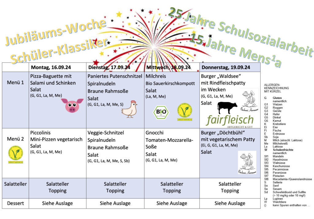 Diese beiden Jubiläen sind der Anlass für eine „Schüler-Klassiker-Jubiläums-Woche“ in der Mensa. Die Mensa bietet seit Oktober 2009 ein ausgewogenes und abwechslungsreiches Mittagessen an.