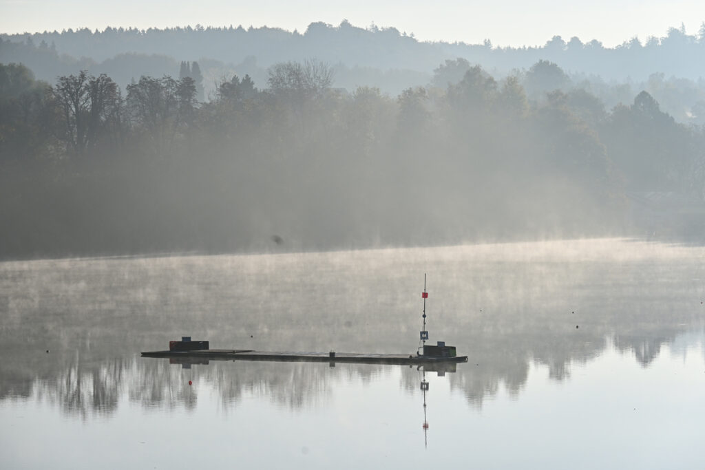 Ein Floß, mitten im See zwischen zwei Bahnen verankert, diente als provisorische Startanlage (Bild). Wie bei den Profis wurden die Boote ausgerichtet. Auf das „Los“ des Starters legten sich die Ruder-Amateure kräftig in die Riemen. So richtig im gleichen Takt waren die Vier an den Riemen nicht immer. Aber es gab ja noch einen Fünften am Steuerruder, der das größte Chaos im Zaum und das Boot auf Kurs hielt.