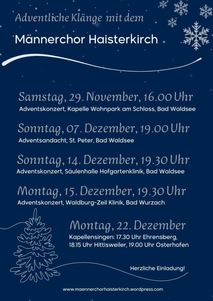 Haisterkirch – Der Männerchor Haisterkirch hat sich auch in diesem Jahr wieder gut vorbereitet, um seine Zuhörer in verschiedenen Veranstaltungen auf die Advents- und Weihnachtszeit einzustimmen. Die Chorleiterin Katrin Reichle hat dafür ein abwechslungsreiches und stimmungsvolles Repertoire zusammengestellt. Im Folgenden alle Termine im Überblick, zu denen Gäste und Bürger aus dem Haistergau und der Kurstadt herzlich eingeladen sind: