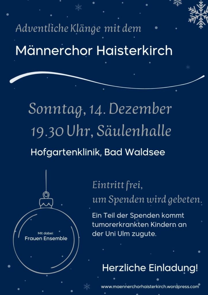 Haisterkirch/Bad Waldsee – Am kommenden Sonntag, 14. Dezember, um 19.30 Uhr, lädt der Männerchor Haisterkirch unter der Leitung von Katrin Reichle herzlich ein zum Adventskonzert in die Säulenhalle der Hofgartenklinik Bad Waldsee.