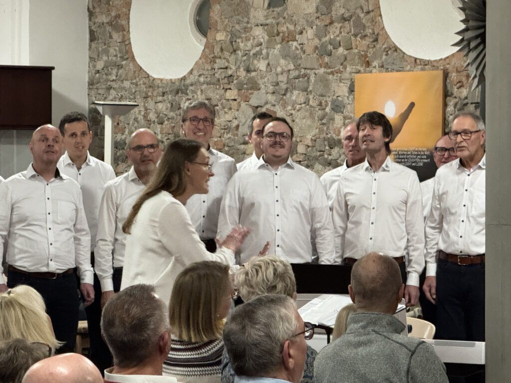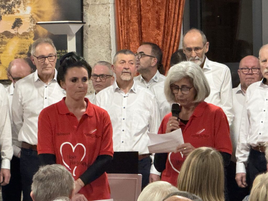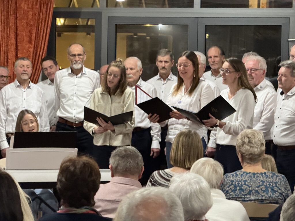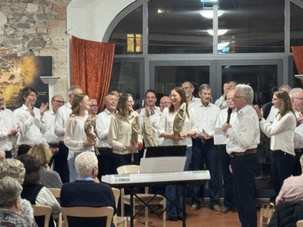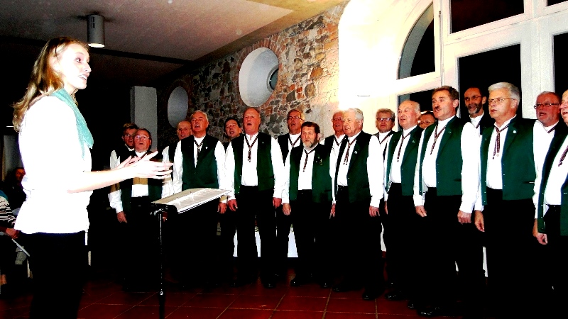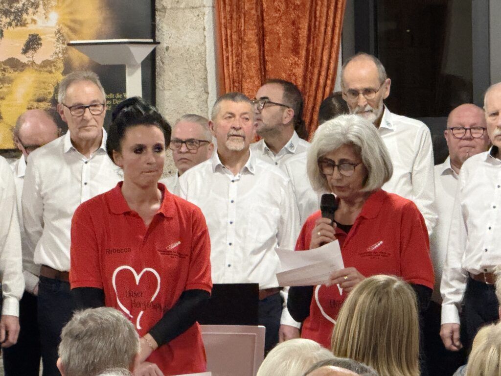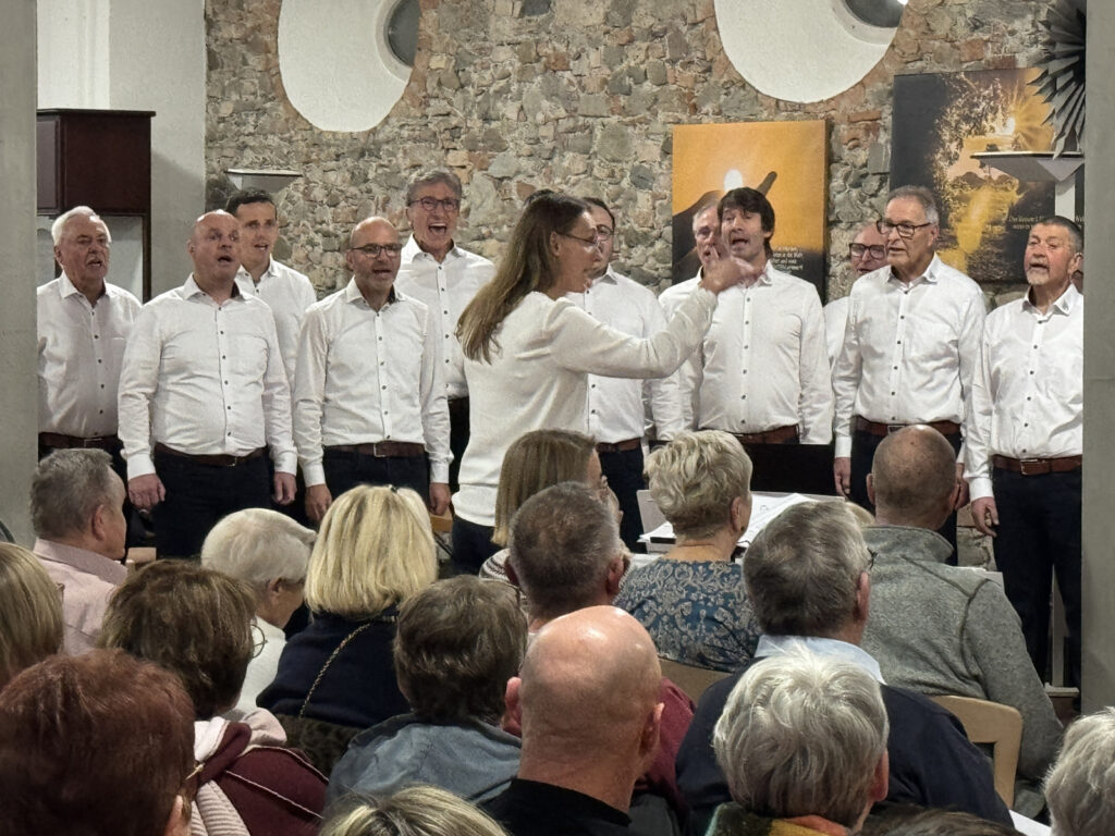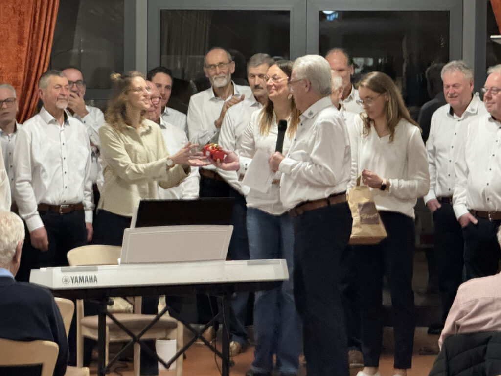 Die gemeinsam mit dem Publikum gesungenen Lieder begleitetete Verena Westhäußer souverän ebenfalls am Keyboard. Der 1. Vorsitzende des Männerchors Werner Schach begrüßte die Gästeschar, bedankte sich vorab für die immense Probenarbeit von Katrin Reichle. Mit passenden Beiträgen hatte Katrin Reichle drei Blöcke, thematisch ausgerichtet auf Winterliches, Adventliches und Weihnachtliches, ausgewählt. Der 43-köpfige Männerchor trug vielstimmig, stimmstark, ansprechend getragen, ein Dutzend Lieder vor. Großen Beifall gab es jeweils auch für Werner Schach, Werner Hirsch, Thorsten Pöhl, Ralf Haller, Gebhard Rothenhäusler und Katrin Reichle, die mit besinnlichen, auch heiteren Texten und Gedichten das Lieder-Programm ergänzten. Deutlich erkennbar war, dass es vielen Gekommenen gut tat, während des eineinhalb-stündigen Konzerts abschalten zu können von all den Alltagsproblemen. Lang anhaltenden und riesigen Beifall gab es für all die Akteure Der Applaus schwoll nochmals an, als Geschenke für die Sängerinnen, für Katrin Reichle und Stefan Werner überreicht wurden.
