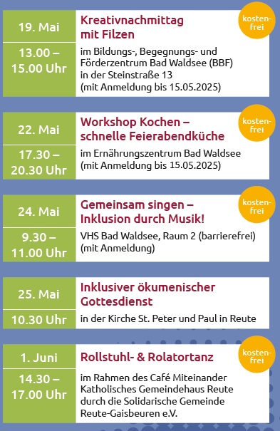 Es sind alle interessierten Bürgerinnen und Bürger zur Teilnahme zu den unterschiedlichen Veranstaltungen herzlich eingeladen. Die Veranstaltungen sind gefördert durch die Aktion Mensch.