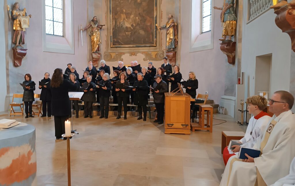 Mit feierlichem Chorgesang gestaltete der Kirchenchor unter der Leitung von Felicia Wieland und Leo Straßner an der Orgel den Festgottesdienst. Erhebend war die Interpretation von Psalm 139 „Du umschließt mich von allen Seiten“. Besonders für den Vortrag „Du großer Gott, wenn ich die Welt betrachte“ gab es spontanen Beifall der Gläubigen.
