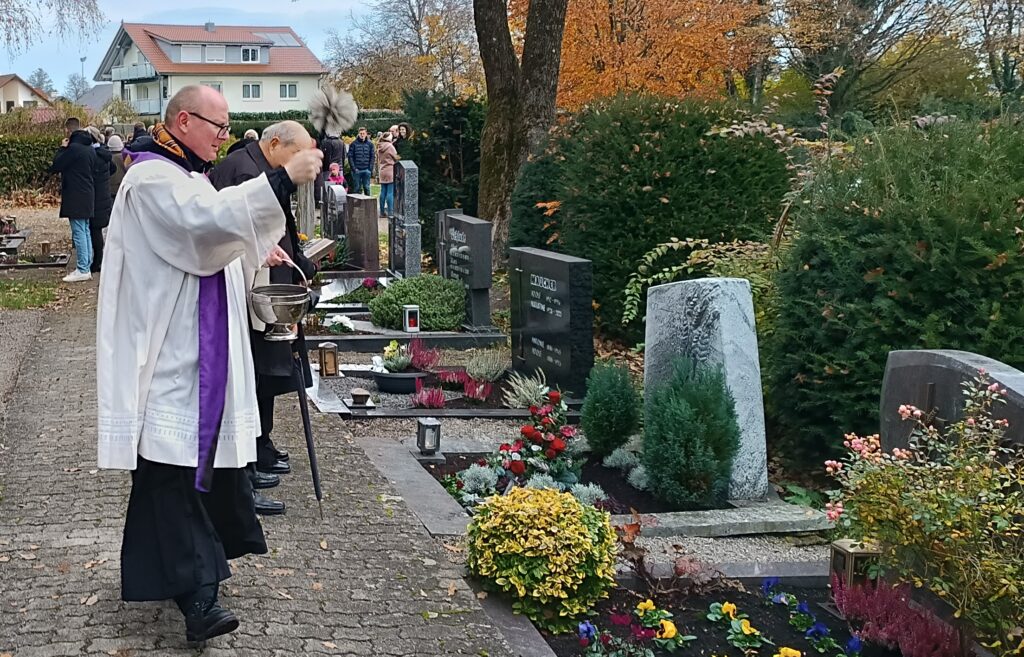 Auf dem Friedhof wurden die Namen der im vergangenen Jahr verstorbenen Gemeindemitglieder vorgetragen, es waren sieben Frauen und vier Männer, dazu zehn Schwestern vom Kloster Reute. Die Gedenkfeier wurde von der Musikkapelle Reute-Gaisbeuren mit Liedern und Chorälen umrahmt. Zum Abschluss ging Pater Hubert durch die Reihen des Friedhofs und besprengte die Grabstätten mit Weihwasser.