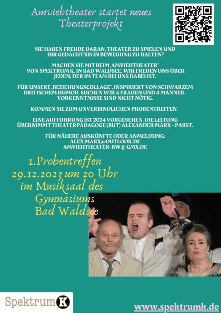 Bad Waldsee – Sie haben Freude daran, Theater zu spielen und Ihr Gedächtnis in Bewegung zu halten? Dann machen Sie mit beim Theaterprojekt “Amviehtheater”. Das erste Probetreffen findet statt am 29. Dezember um 20.00 Uhr im Musiksaal des Gymnasiums. Nachstehend veröffentlicht die Bildschirmzeitung ein Plakat mit detaillierten Informationen: