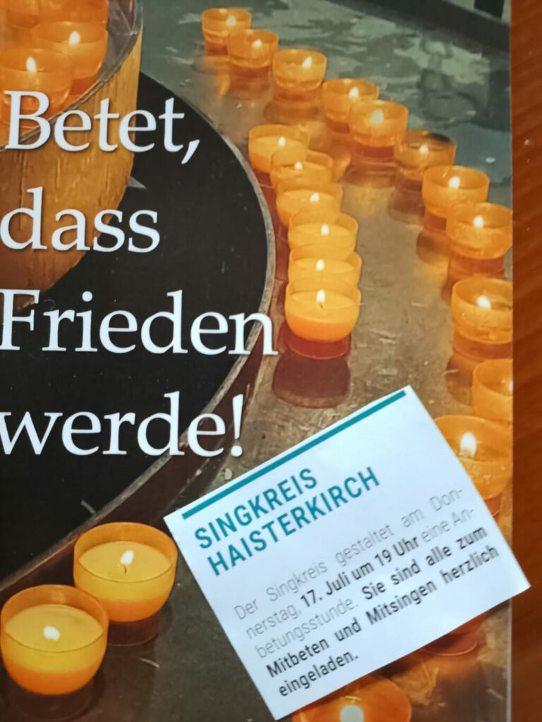 Haisterkirch – Der Singkreis Haisterkirch gestaltet am Donnerstag, 17. Juli, um 19.00 Uhr eine Anbetungsstunde in der Pfarrkirche in Haisterkirch. Sie sind eingeladen zu einer kleinen Auszeit mit vielen Liedern, kurzen Andachts- und Textimpulsen. Auch das Gebet um den Frieden wird seinen Platz haben.