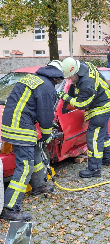 Die Übung begann mit der Demonstration, was Ersthelfer machen können, wie ein Notruf über Handy / Telefon funktioniert und wie die Alarmkette dadurch in Gang gesetzt wird. Im weiteren Verlauf rückte die Abteilung mit ihrem TSF-W an und befreite eine verletzte Person aus dem Fahrzeug. Eine weitere Person war bereits durch die Ersthelfer befreit und versorgt worden.