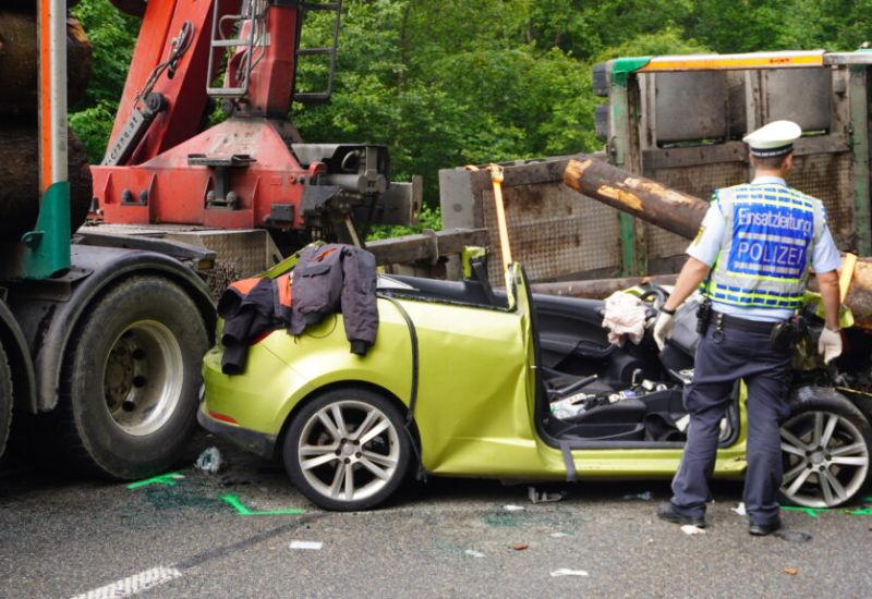 Der voll beladene Anhänger des Holzlasters war ins Schlingern geraten, als der 27 Jahre alte Lkw-Fahrer aus noch unbekannter Ursache auf das Bankett geriet. Insgesamt dürfte sich der Unfallschaden auf mehrere zehntausend Euro belaufen, am Seat entstand wirtschaftlicher Totalschaden. Während der Unfallaufnahme und der Abschlepp- und Reinigungsarbeiten war die Landessstraße bis etwa 11.00 Uhr voll gesperrt.