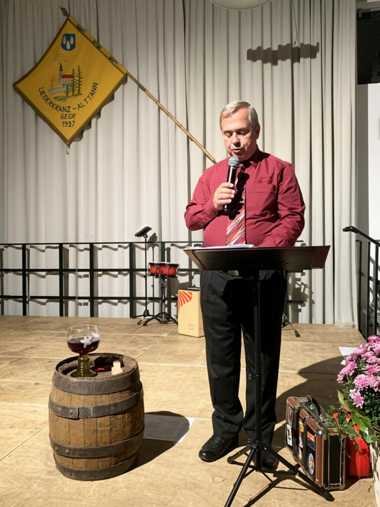 Matheis strapazierte die Lachmuskeln weiter mit dem Gedicht „D‘r Gsangverei“ (Sebastian Blau), wo erst mal „nohmol jeder huastat, die Mäuler sperrangelweit uf send, dia Manna kommet net nuf, hohl dr Bierbrauerbass sei, aber dr Gsang aufs Gmüat gehe und schließlich durstig macht“.