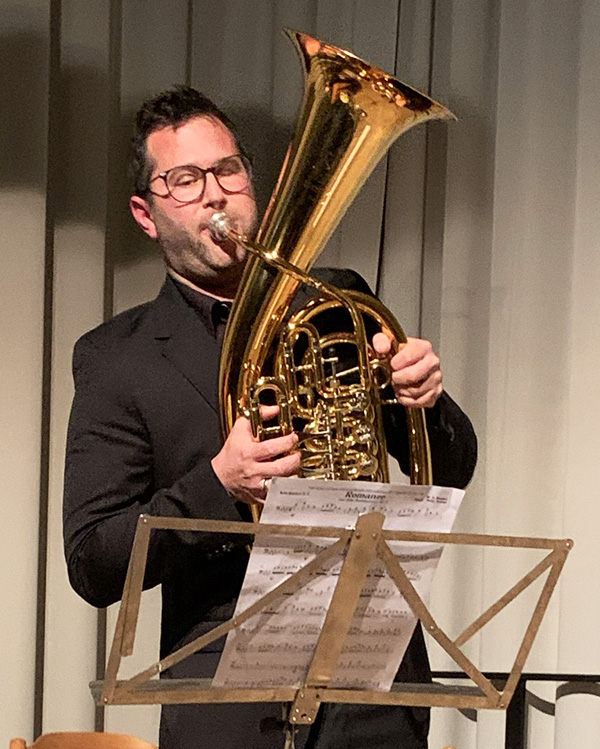Auf der Bühne wurde nun Platz gemacht für die Überraschung, die der Männerchor in jedem Konzert bereithält. Diesmal war es Manuel Zieher von der Bruno-Frey-Musikschule Biberach, Dirigent der Stadtkapelle Bad Schussenried und im Ensemble der oberschwäbischen Dorfmusikanten, die Schad so lange führte. Manuel Zieher am Tenorhorn (Bild) und Franz Ott spielten im Duett Mozarts Romanze aus der „Kleinen Nachtmusik“. Wenn dies auf nur zwei Instrumenten interpretiert wird, fordert das besonderes Können. Mit tollen Läufen und bestens aufeinander eingespielt trugen beide diese Romanze vor.