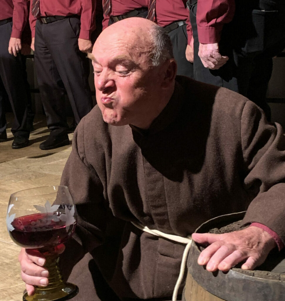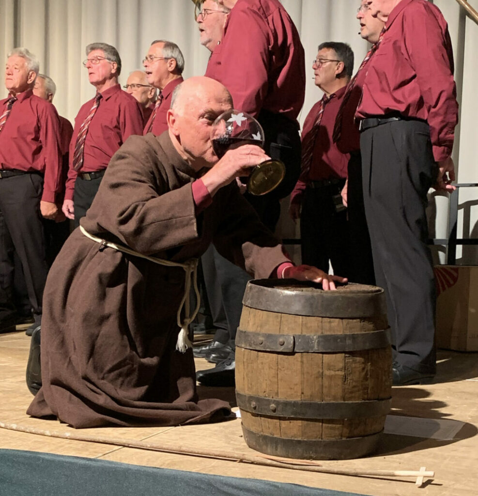 Lustig wurde es wieder mit dem „Frater Kellermeister“. Egon Gaidzik in Mönchskutte (Bild) begab sich zum auf der Bühne stehenden Fass mit vollem Weinglas, hatte er doch den strengen Auftrag seines Abtes, den besten Wein zu finden. Er tat dies bei allen Winzern und Kneipen und lässt so seinen Abt bis heute auf das Ergebnis warten, so gewissenhaft führte er seinen Auftrag aus! Dass ihm dabei Kopf und Zunge bisweilen schwer wurden, demonstrierte er absolut überzeugend. Ganz in diesem Sinne hatte Matheis diese spaßigen Szenen angesagt. Demnach gelte der Wein doch auch als Arznei, die den Patienten stets jünger mache. Aber bei seinen Selbstversuchen sage seine Frau stets, „heut siehst aber wieder alt aus“, genau wie der Frater hier.