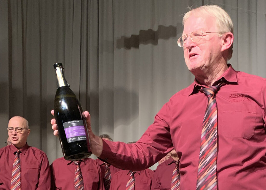 Humorvoll beschrieb Matheis davor den Wettstreit zweier Winzer aus dem Ahrtal und von der Mosel. Sie wollten ihrem Wein zugkräftige Attribute geben wie Ahrblume, Moselperle und überboten sich dabei, bis der Moselwinzer zum entscheidenden Sieg ansetzte und sein Produkt Moselschlecker nannte, was der Ahrtaler niemals übernehmen konnte! Zwei gelungene Weinlieder stimmten die Männer aus Erfahrung freudig an.