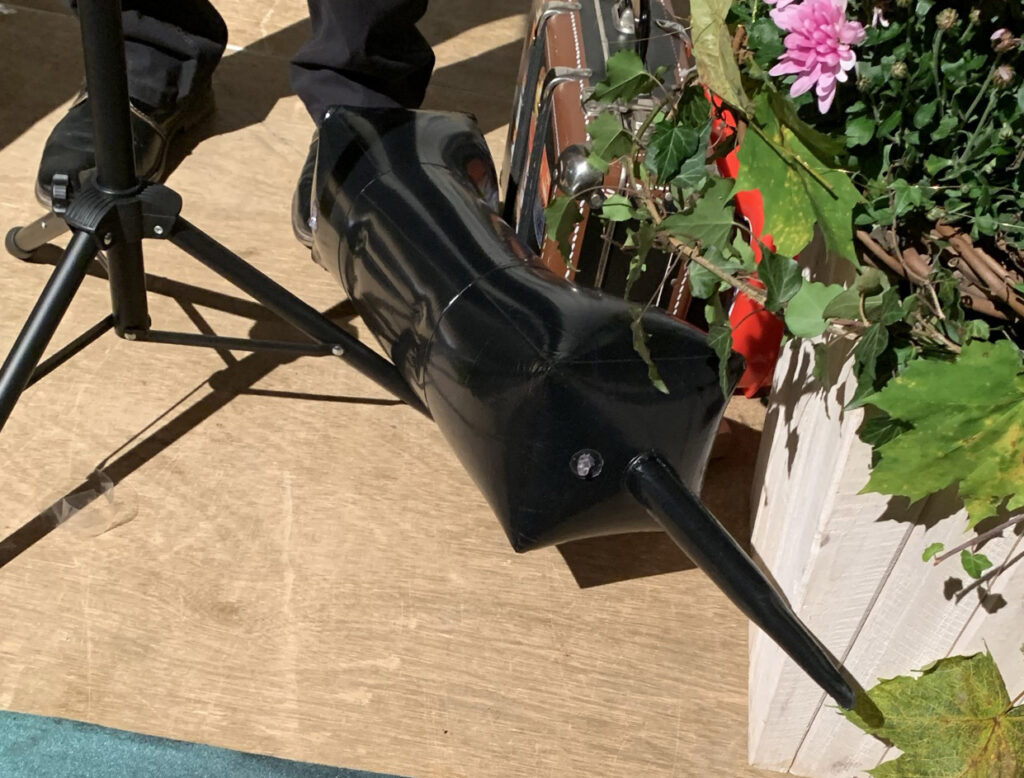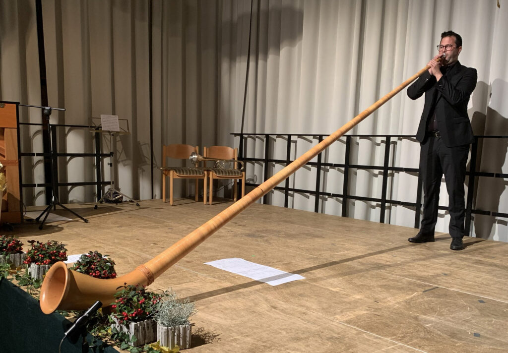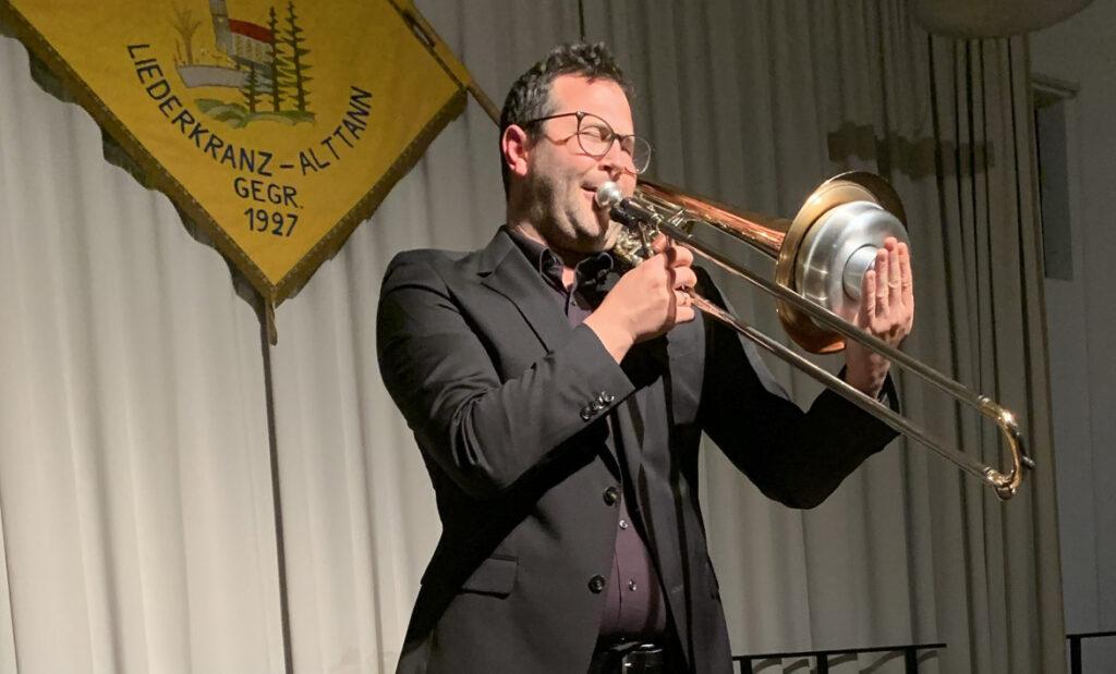 Für Manuel Zieher wurde die Bühne erneut geräumt. Auf der Posaune mit Dämpfer und Hand spielte er die „Froschpolka“ (Bild). Dabei ließ er vom Ochsenfrosch über die Kröte bis zum kleinen Frosch ihr Quaken hören, was die Gäste wiederholt staunend lächeln ließ. Auch sein Alphorn hatte Zieher mitgebracht, auf dem er schwierigste Fantasien in hohen und sehr tiefen, in leisen und lauten Tönen mit präziser Lippenspannung spielte. Dafür erntete er lang anhaltenden Applaus.