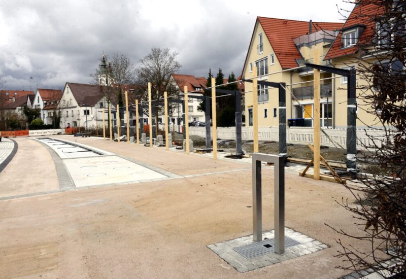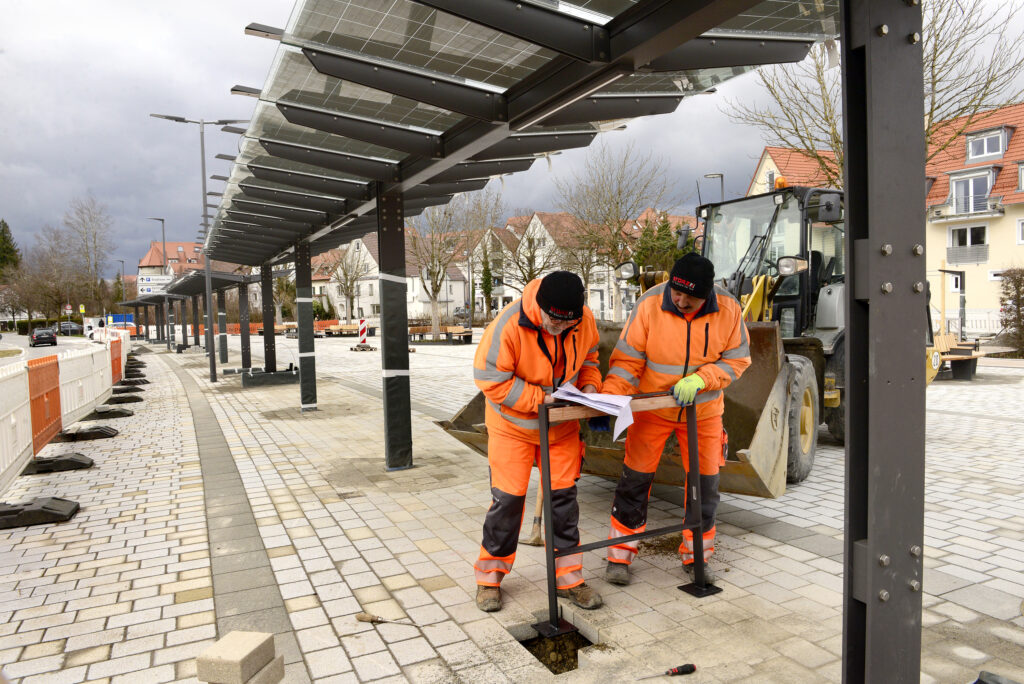 Derzeit finden letzte Arbeiten an der Pergola und am neuen Wasserbecken sowie an den neuen Fahrgastunterständen für die Bushaltestellen und den mit Photovoltaik überdachten Fahrradabstellplätzen statt.