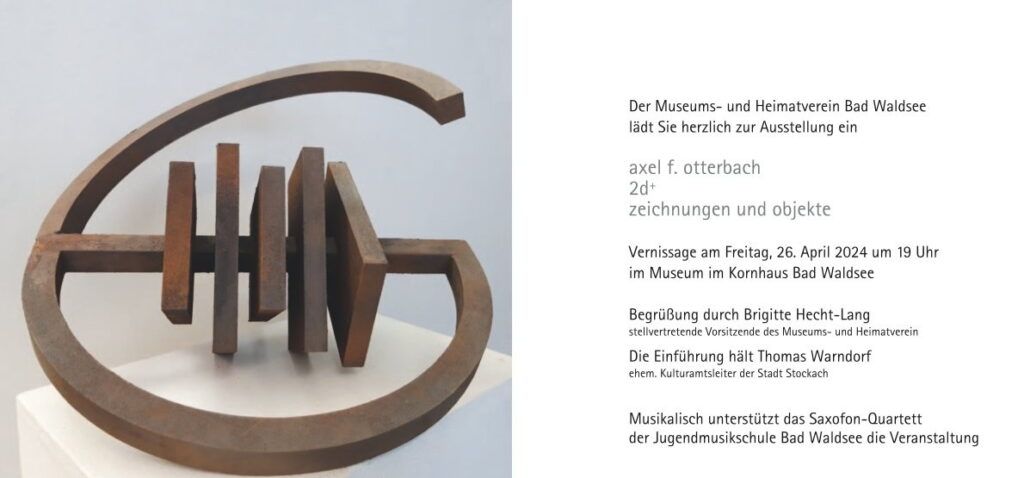 axel f. otterbach 2d + Zeichnungen-Objekte eröffnet. Die Begrüßung erfolgt durch Brigitte Hecht-Lang, stellvertretende Vorsitzende des Museumsvereins. Die Einführung hält Thomas Warndorf, ehemaliger Kulturamtsleiter der Stadt Stockach. Musikalisch unterstützt das Saxofon-Quartett der Jugendkunstschule Bad Waldsee die Veranstaltung.