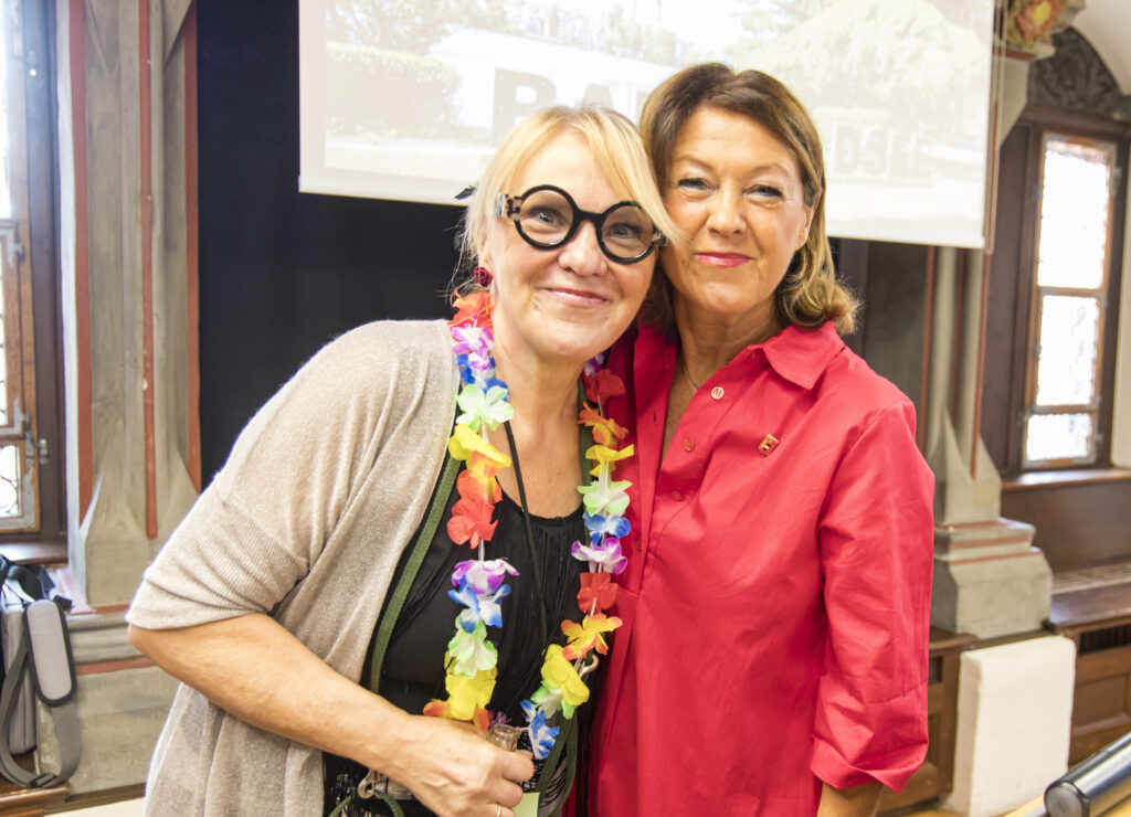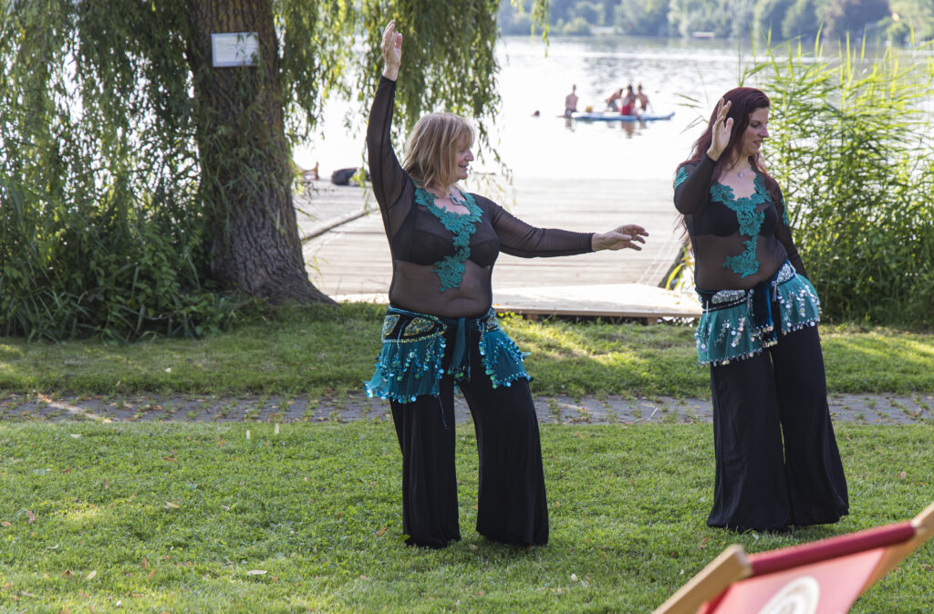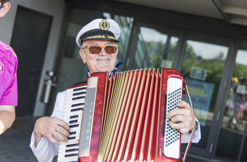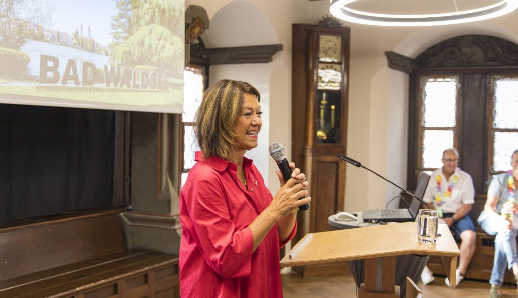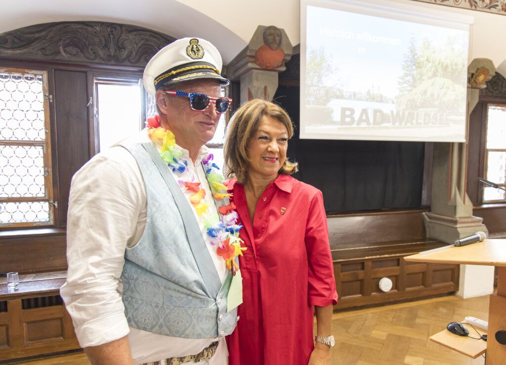 Die Crew teilte die Gäste in vier Gruppen auf, um so einen Stau auf der Strecke zu vermeiden. Die Besatzung hatte sich für die Stopps einiges einfallen lassen. Einen Halt gab es am Haus am Stadtsee, dort spielte ein Musikerensemble Seemannslieder, am Bootshaus tanzte eine kleine Frauengruppe einen orientalischen Bauchtanz. Historische Geschichten hörte man am Labyrinth hinterm See und als letzte Station wurden alle im Rathaus von Bürgermeisterin Monika Ludy auf das Herzlichste empfangen. Im Sitzungssaal lauschten die Gäste einem informellen Vortrag über unsere Stadt zu. Kapitän Roland Haag bedankte sich mit einem Blumenstrauß, auch im Namen der Crew und der Gäste, bei Bürgermeisterin Monika Ludy.