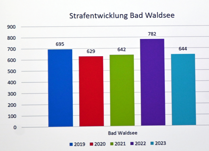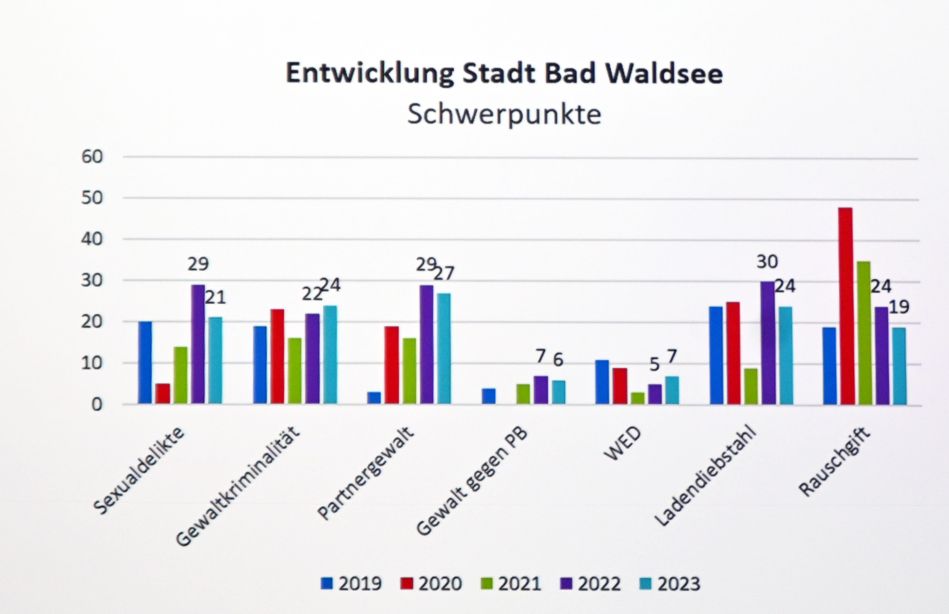 Die Straftaten in Bad Waldsee sind Rückläufig. Wurden 2022 insgesamz 782 Straftaten registriert, so waren es 2023 noch 644. Das positive Bild wird unterstrichen, wenn man die für das allgemeine Sicherheitsempfinden relevante Taten im Einzelnen anschaut. Bei Sexualdelikten, Partnergewalt, Gewalt gegen Polizeibeamte, Wohnungseinbruchdiebstahl, Ladendiebstahl und Rauschgiftstraftaten konnte allgemein ein Rückgang verzeichnet werden. Zu den Sexualdelikten merkte Polizeirat Herzhauser an, dass in Bad Waldsee keine Vergewaltigung registriert wurde. Sexualdelikte würden hingegen im Bereich Pornografie im Internet registriert. Bei der Gewaltkriminalität registrierte die Polizei mit 24 Straftaten im Jahr 2023 zwei mehr als im Vergleichsjahr 2022. Hier kam es laut Herzhauser auch zu Verschiebungen innerhalb der Statistik, da die Straftatbestände geändert wurden. So kann zum Beispiel ein Tritt mit einem Stiefel in einer Auseinandersetzung diese in den Bereich der Straftat bringen.