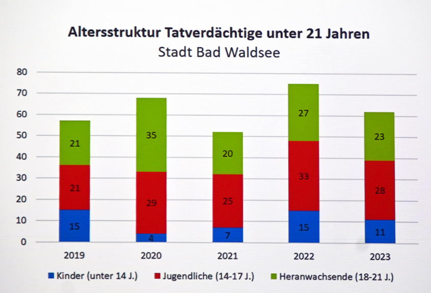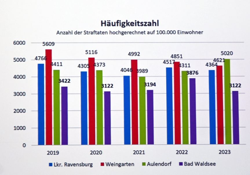 Würde man die Straftaten hochrechnen auf 100.000 Einwohner, stellt sich die Lage in Bad Waldsee deutlich günstiger dar als im vergleichsweise kleinen Aulendorf. Im Landkreis Ravensburg kämen auf 100.000 Einwohner 4364 Straftaten, in Weingarten 4621, in Aulendorf 5020 und Bad Waldsee bildete das Schlusslicht mit 3122 Straftaten.