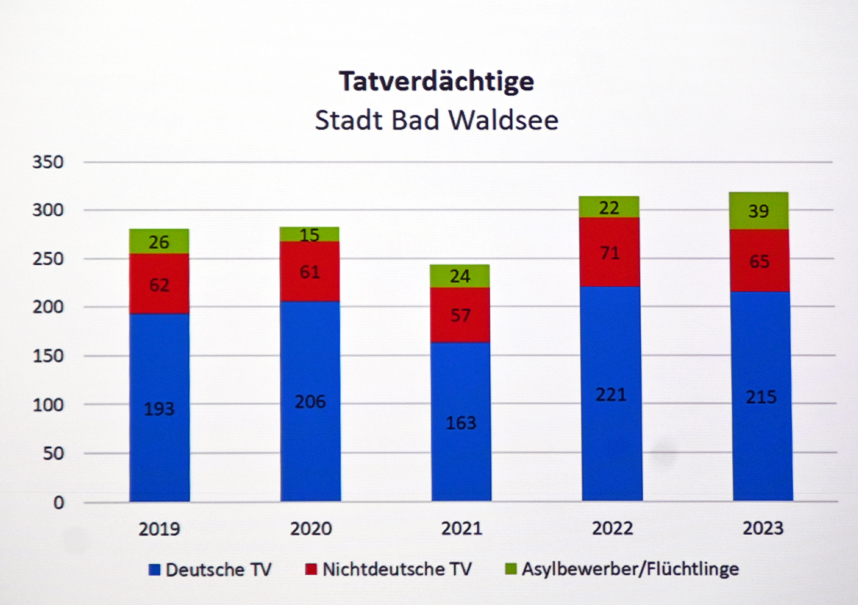 Bei den Tatverdächtigen haben, korrelierend mit den Einwohnerzahlen, die Deutschen die Nase vorn. 2023 standen 215 Deutschen 65 Nichtdeutsche und 39 Asylbewerber/Flüchtlinge gegenüber.