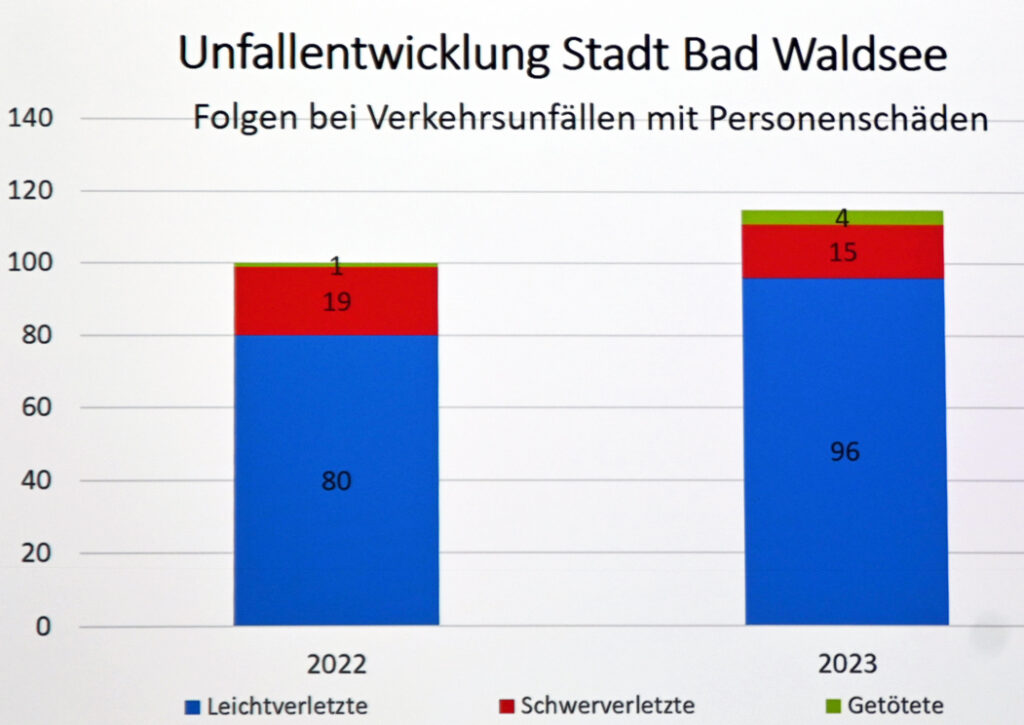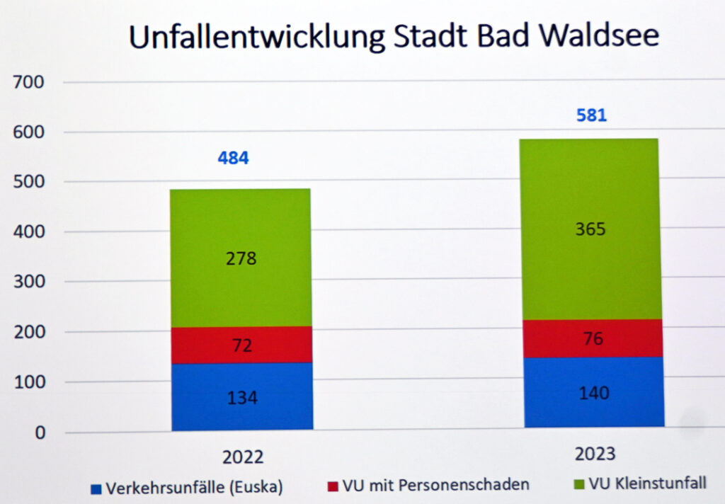 Anders als bei den Straftaten sieht es bei den Verkehrsunfällen aus. Hier stieg die Zahl der registrierten Unfälle von 484 in 2022 auf 581 in 2023. Davon waren 365 sogenannte Kleinstunfälle, 76 waren mit Personenschaden und 140 Unfälle passierten auf besonders gefährdeten Streckenabschnitten.