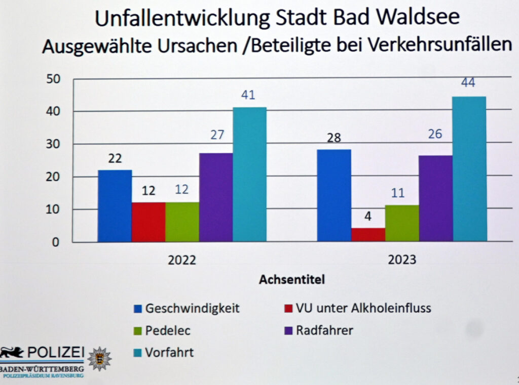 Die meisten Unfälle wurden durch Nichtbeachten der Vorfahrt verursacht. Am zweithäufigsten waren Rad- und Pedelecfahrer in Unfälle verwickelt. Hier gibt die Statistik keine Auskunft, wie es zu den Unfällen kam, ob sie eher von den Zweiradfahrern oder den anderen Verkehrsteilnehmern verursacht wurden. Nur vier Unfälle wurden 2023 durch Trunkenheit am Steuer verursacht, ein erfreulicher Rückgang gegenüber 12 im Jahr davor. Zu flotte Fahrweise führte 2022 zu 22 Unfällen, die Raser ließen auch die Unfälle rasant ansteigen, auf 28 in 2023.