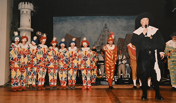 Mords Comedia in der Anfangszeit (um 2000); vorne Franz Daiber als „Dottore”. Die Mords Comedia bereicherte die Waldseer Fasnet über ein Vierteljahrhundert (bis 2023). Pfiffig und witzig nahm das „Teatro“, garniert mit gekonnten Flötentönen, das kommunale Geschehen auf die Schippe. Das „Aufsagen“ in den Wirtshäusern mit italienischem Schwäbisch war echte Fasnetskunst. DBSZ-Archivbild