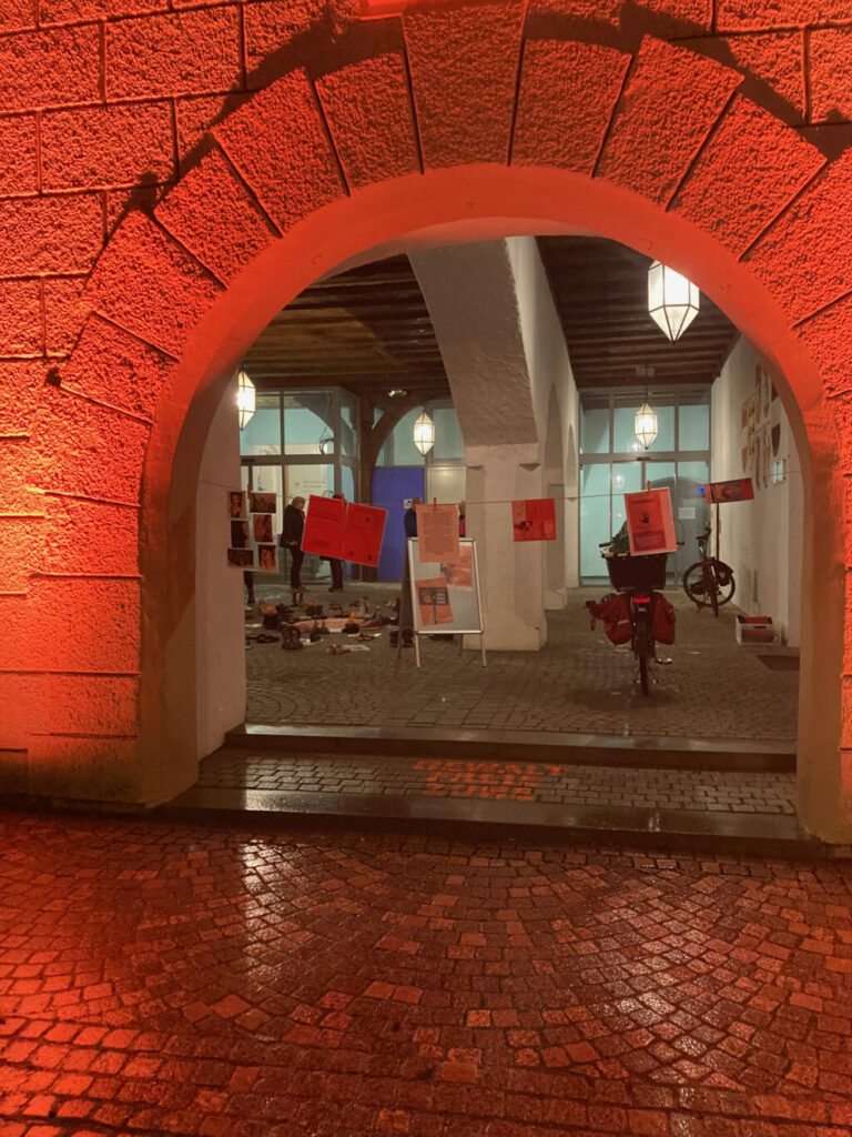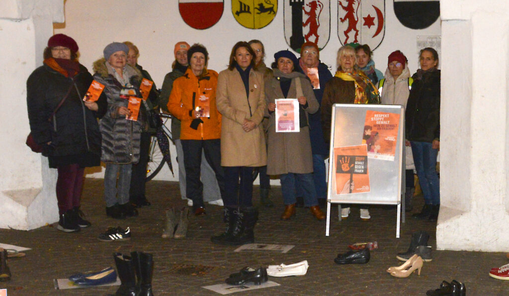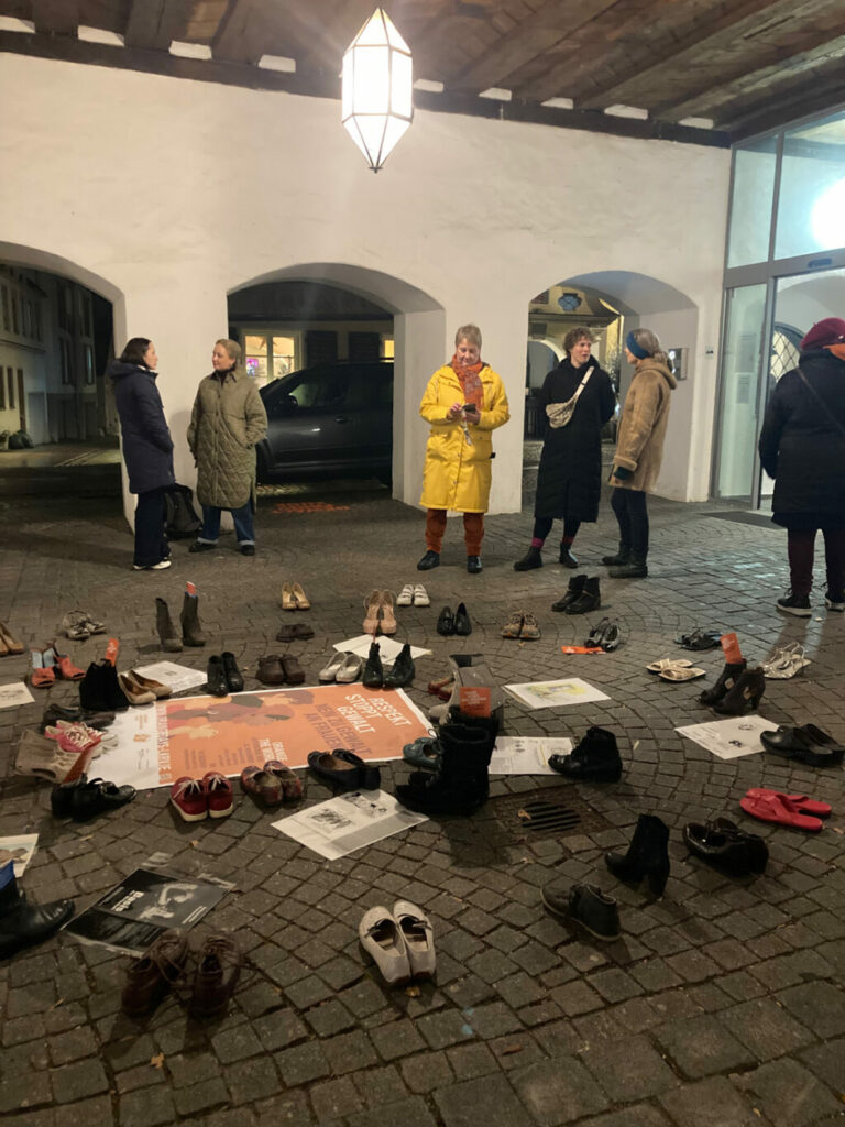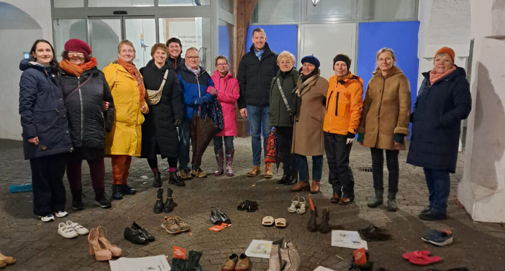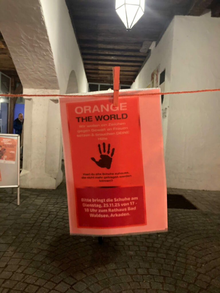 Unter den Rathausarkaden stellte eine Gruppe Bad Waldseer Frauen (Frauensolidarität Bad Waldsee, AK Humanitäre Hilfe) Dutzende Paar Schuhe als stilles Mahnmal auf. Jedes Paar stand sinnbildlich für eine Frau, die von Gewalt betroffen ist. Kleine Botschaften wie „Gewaltfreie Zone“ oder „Du bist nicht allein“ begleiteten die Installation und regten Passantinnen und Passanten zum Innehalten an.