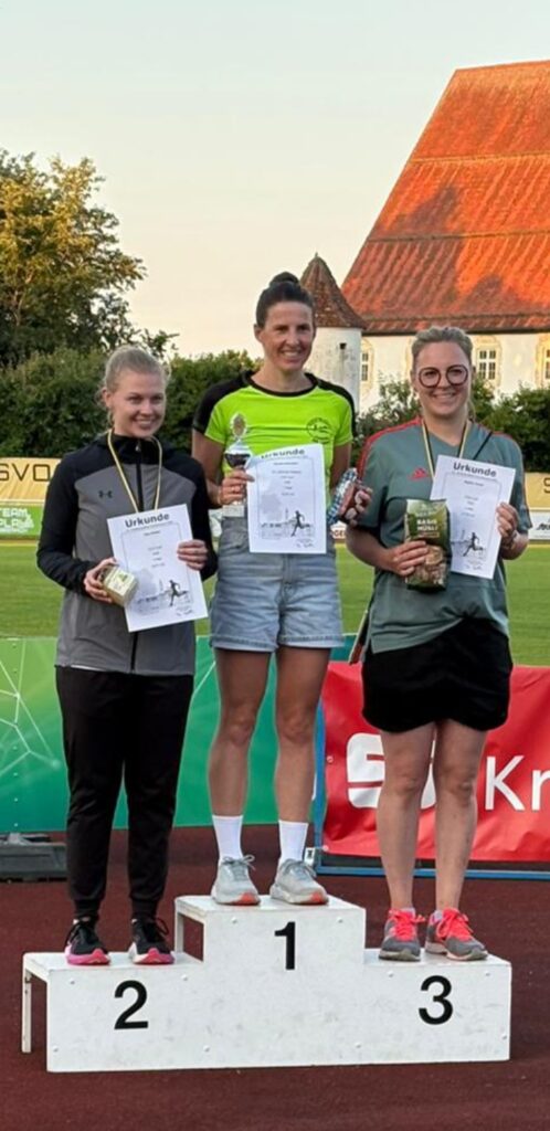 Bad Waldsee – Drei junge Sportlerinnen, die vor Freude strahlen und mittendrin Sandra Rauneker von der TG Bad Waldsee, die mit einer Spitzenleistung über 5000 Meter den 1. Platz in ihrer Klasse W30 und den 3. Platz unter allen Frauen erkämpfte.