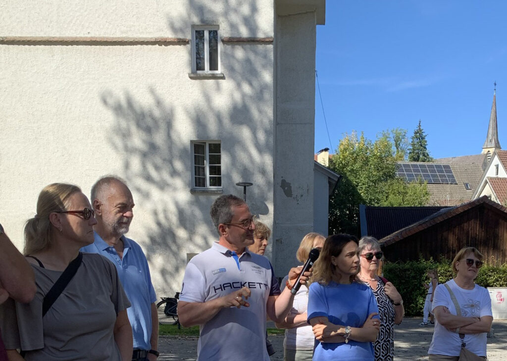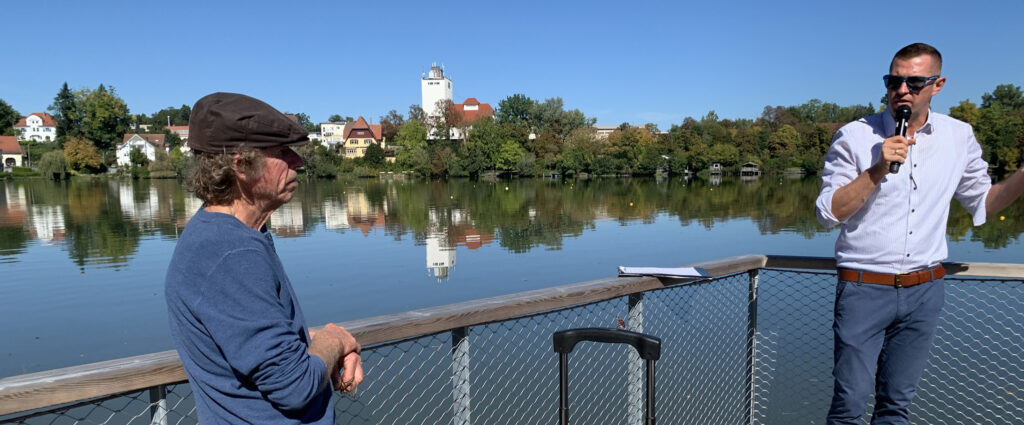 Nächste Halts des Spaziergangs waren der Klosterhof und der Steg am Bootsverleih. Der bisherige Boule-Platz solle auf jeden Fall bleiben, aber über die Parkmöglichkeiten müsse im Sinne eines architektonischen Ensembles zwischen Altstadt und Wasser (Stadtsee) diskutiert werden, was im Hasenwinkel weniger der Fall sei, weil es sich dort um einen Hinterhof handele. Am Steg wurde über den BAG-Green-Tower diskutiert, wäre das doch ein idealer Aussichtsplatz über den See zur Altstadt-Silhouette? Auch Wege- oder Wasserverbindungen Altstadt-Bahnhofgelände für Gartenschaubesucher war Thema (Gondolettas? Laut Wikipedia ein Bootsbetrieb, bei dem die Boote mit einem unter der Wasseroberfläche geführten Seil über einen vorgegebenen Kurs gezogen werden). Statt des Treppenaufgangs vom See zum Bahnhof wäre ein Aufzug denkbar.