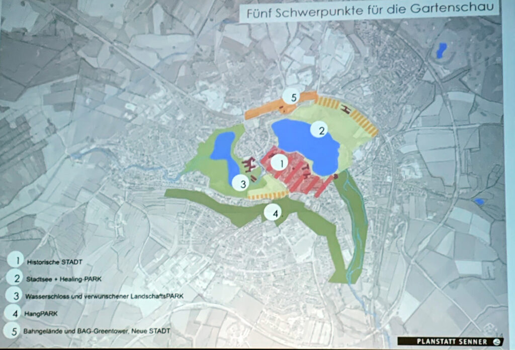 Demnach sollte es eine neue und moderne multifunktionelle Stadthalle geben (Standort auf Kiesrücken oder Krankenhaus?), die Blechlawinen auf der Bleiche sollten gegebenfalls in ein Haus oder unter die Erde, sogar ein Fahrradhaus wünscht der OB, die Festwiese sei Bedarf und die Tennisanlage sollte Richtung Skateranlage gehen. Beide Planerinnen stimmten dem zu, womit ein wirklicher Hangpark zur Geltung käme.