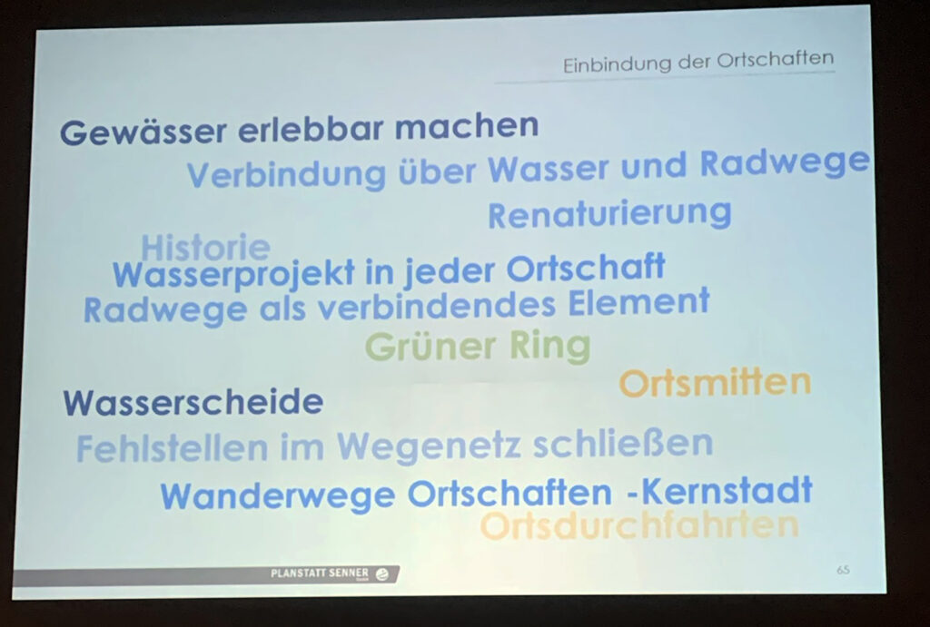 Das Senner-Team stellte einen möglichen Zeitplan vor: 2025-26 Bewerbung, Zuschlag 2027, Rahmenplan 2028-29, Wettbewerb Freiraum und Städtebau 2030, Ausführungsplanung und Umsetzung 2031-36 und Eröffnung 2037. Die beiden Mitarbeiterinnen erläuterten im Detail verschiedene Möglichkeiten in den Keypoints, auch an Projektbeispielen ihres Büros im In- und Ausland. Auch Ideen für die Ortschaften wurden angedacht.