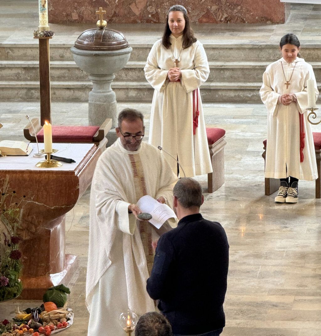 Eine Überraschung am Schluss des Gottesdienstes gab es dann noch für den neuen Ortsvorsteher Matthias Covic, den Pfarrer Werner nach vorne in den Altarraum bat, um für ihn persönlich den Segen Gottes auch zur Bewältigung des Ehrenamts zu erbitten.