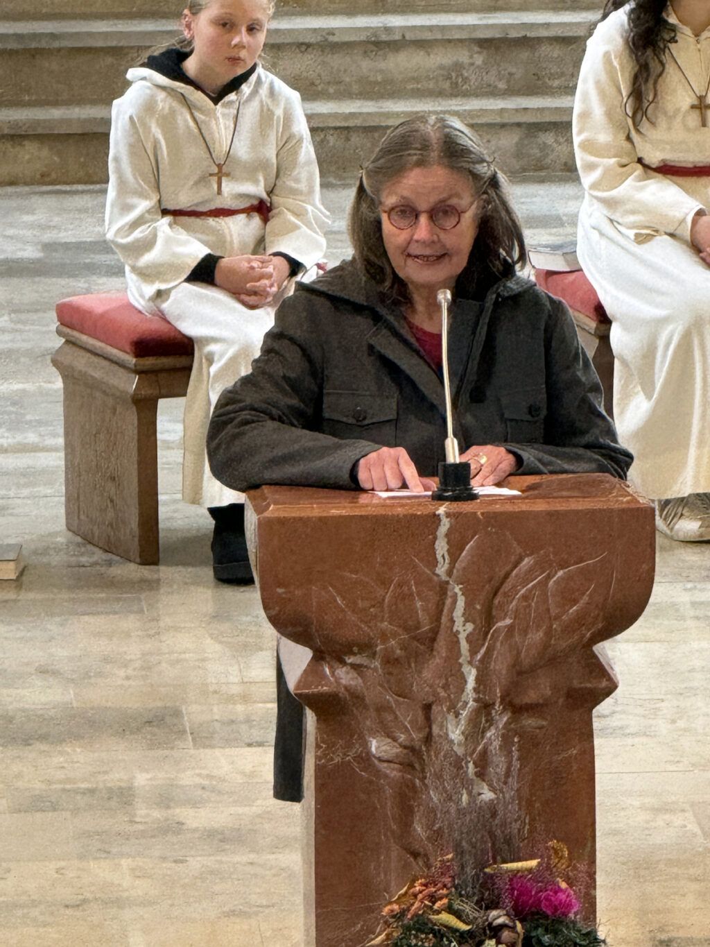 Pfarrer Stefan Werner zelebrierte den festlichen Gottesdienst. Zum Beginn des Gottesdienstes machte er sich auf den Weg in den Mittelgang der Kirche zu einigen der aufgestellten, umkränzten Stelen. Beispielhaft las er einige der dort angebrachten Texte vor. In mühevoller, aufwändiger Arbeit waren die Stelen mit fein säuberlich geschriebenen Dankesworten bestückt worden.