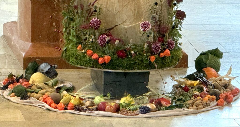 Dieses Stelen-Werk, genauso wie der wunderschön aufgebaute Erntedankaltar, verdankt die Kirchengemeinde den Landfrauen Haisterkirch-Mittelurbach, denen für diese außergewöhnliche Dankes-Dokumentation von den sehr zahlreichen Gottesdienstbesuchern dann großer, anhaltender Applaus gespendet wurde.