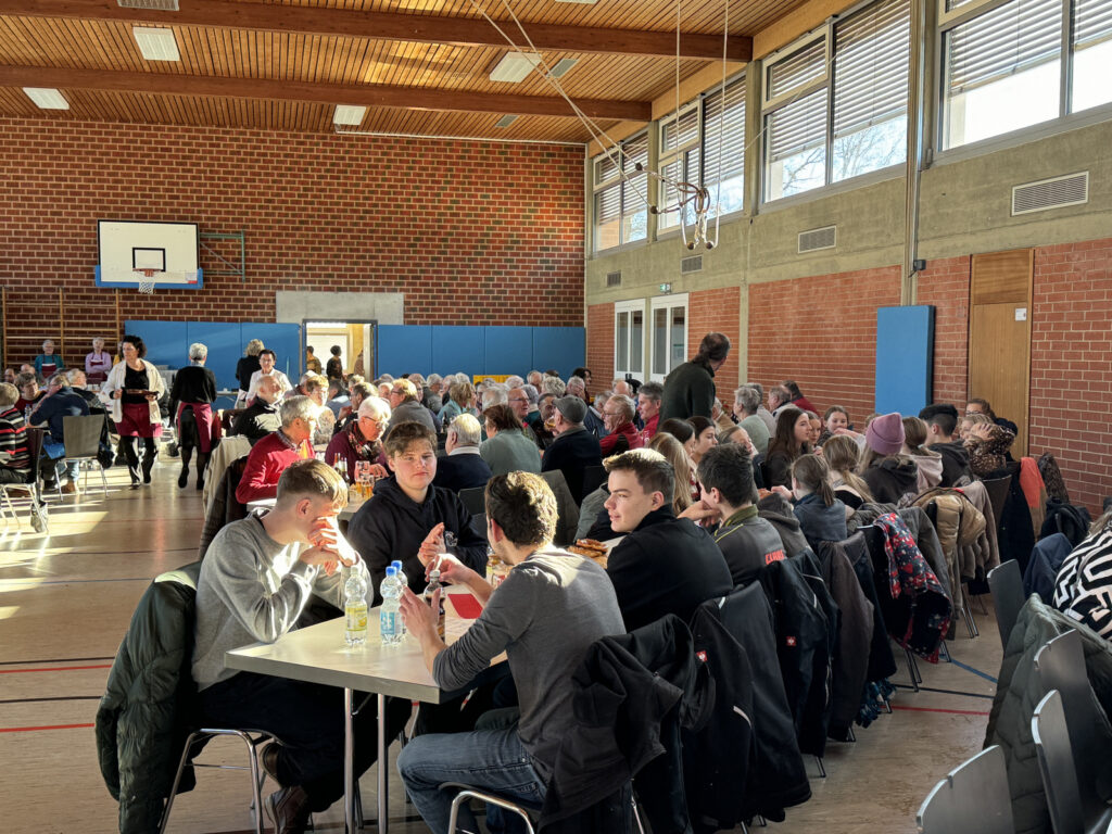 Großes Lob gab es auch für das Engagement von Mitgliedern des Kirchenchors, des Seniorenteams, des Kirchengemeinderats und freiwilliger Helferinnen und Helfer, die Dienste in der Gemeindehalle verrichteten, damit sich Wallfahrtsteilnehmer mit Speisen und Getränken sowie mit Kaffee und Kuchen stärken konnten. Kirchenchormitglieder um den Vorsitzenden Herbert Eisele durften stolz auf ihr 30-jähriges Engagement als Serviceteam sein. Um die Mittagszeit war die Halle voll belegt. Die regionalen, schmackhaften Essensangebote waren von der Metzgerei Frank (Reute) geliefert worden.