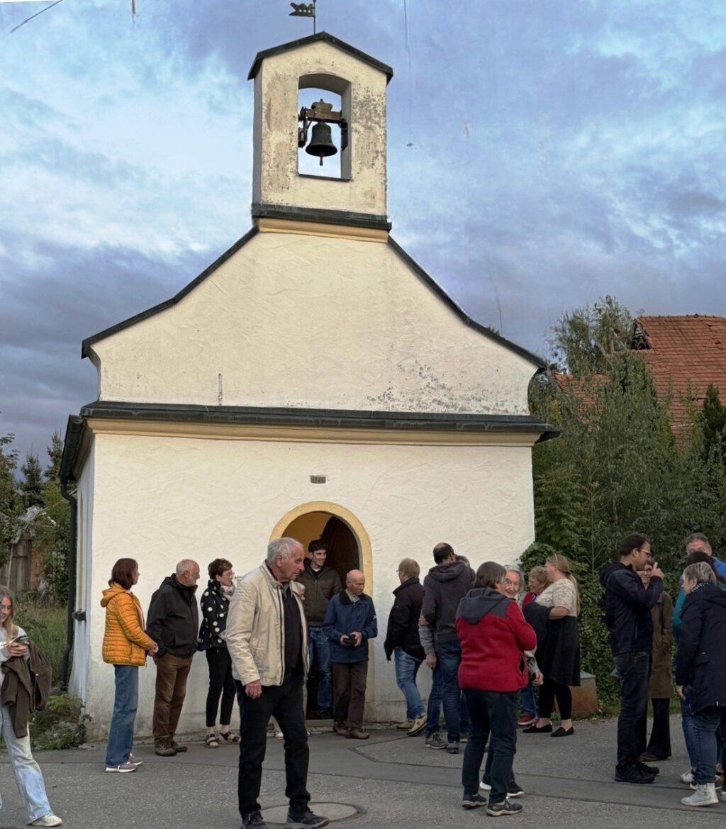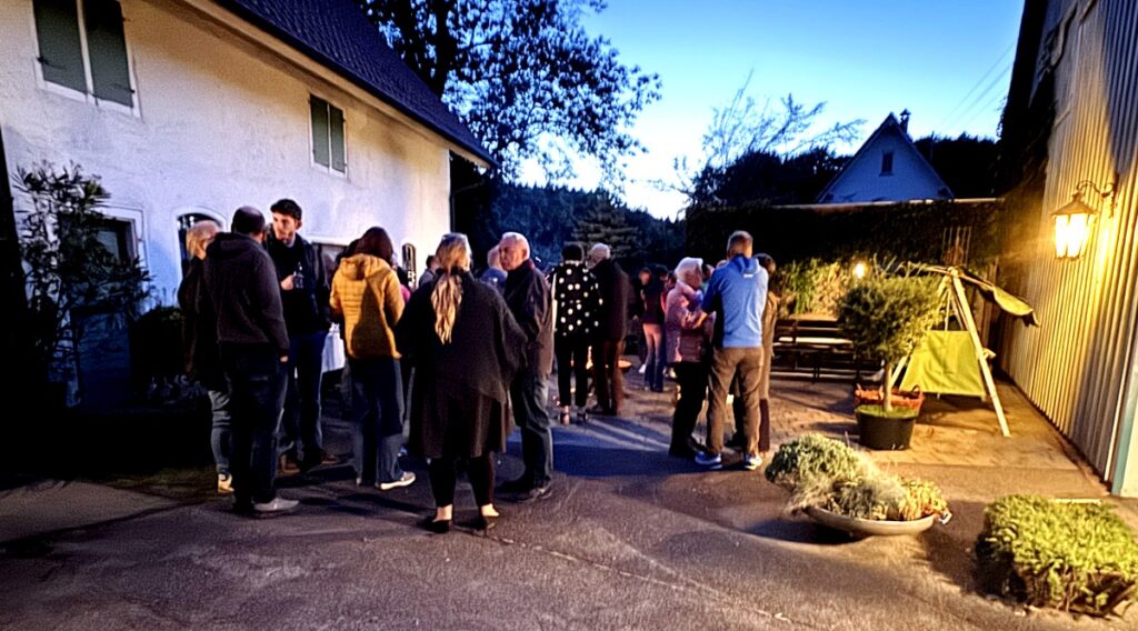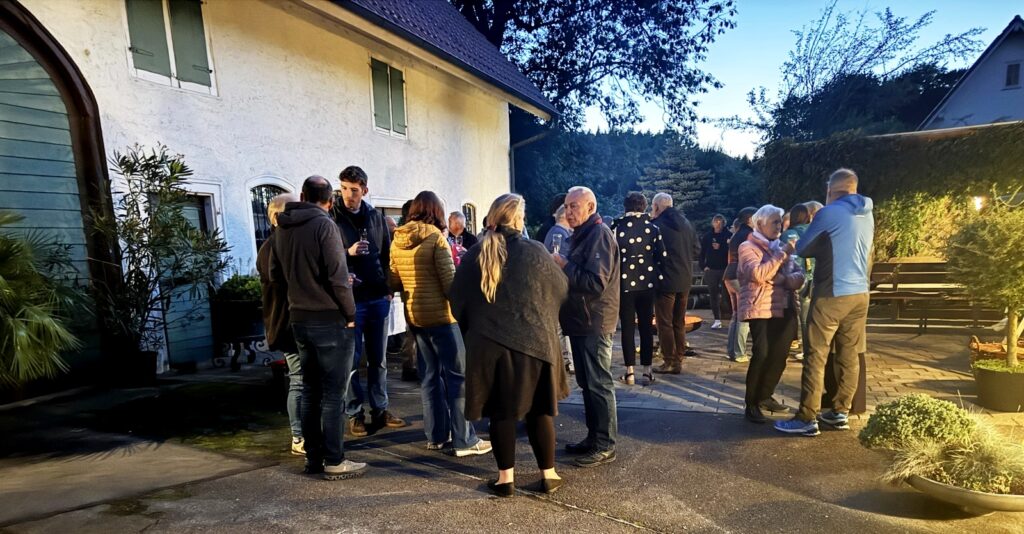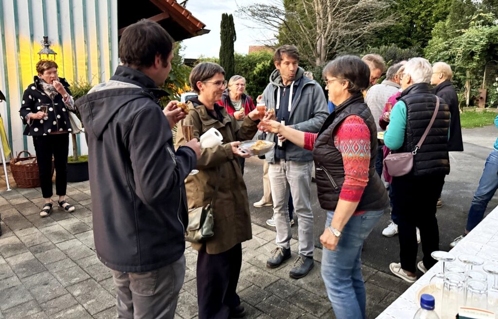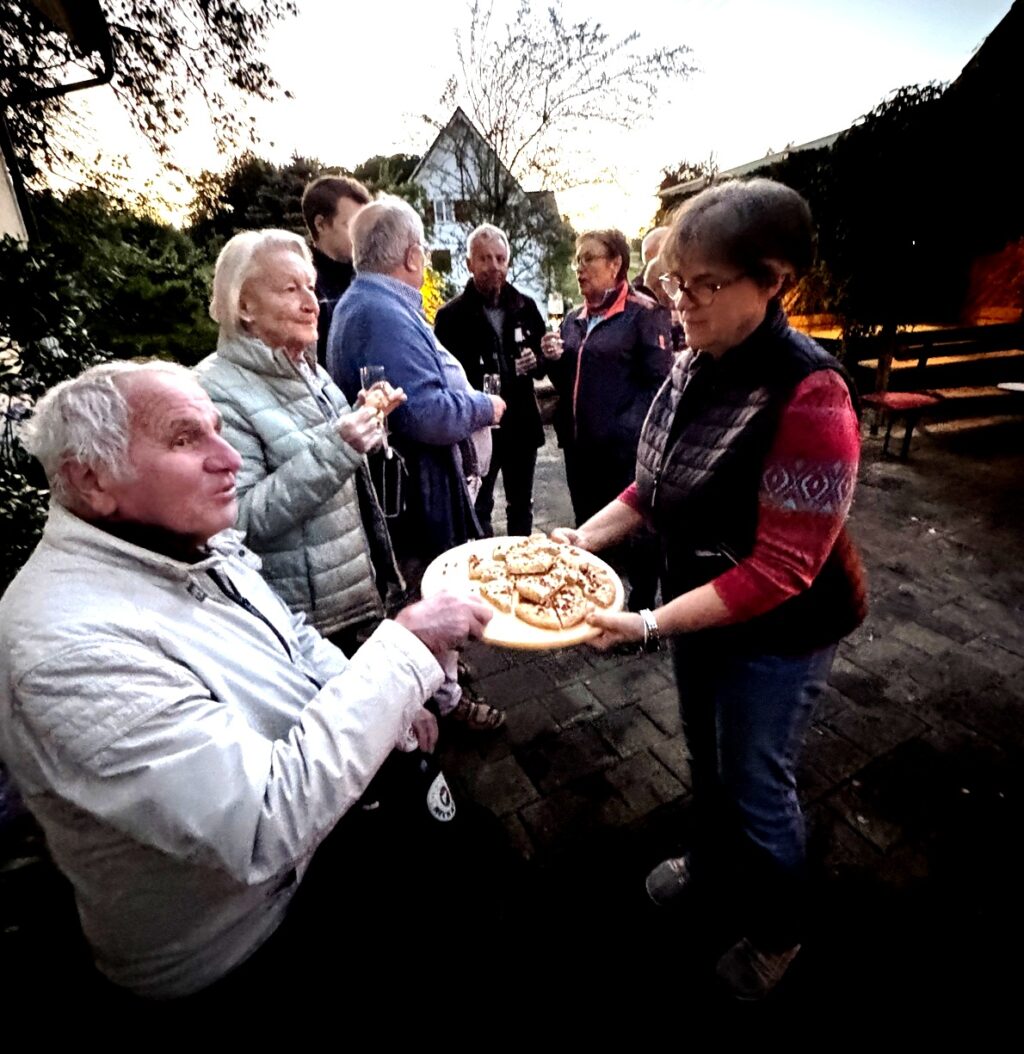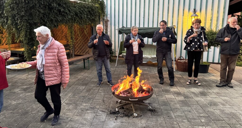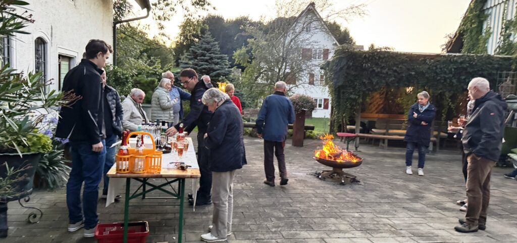 Nach dem Gottesdienst wurden die Gottesdienstbesucher zum schon traditionellen Festausklang bei  Familie Frick ins Areal ihres Hofguts –  nur wenige Schritte von der Kapelle entfernt – eingeladen. Ein Wärme spendendes, großes Schwedenfeuer, das Franz Frick angezündet hatte, war an dem kühlen Abend durchaus gefragt. In der blumen- und pflanzenreichen  Umgebung wurden die Gäste mit Getränken und gespendeten schmackhaften Happen von Monika Frick und Rita Fink verwöhnt. Erwin Fink, der bei der Gästebetreuung auch mithalf, konnte auf Geldspendenreste verweisen, mit denen die Auslagen für die Getränke finanziert werden konnten. Lobes- und Dankesworte wurden beim Patroziniums-Nachfest zahlreich ausgesprochen und dazu der Wunsch geäußert, dass man sich hoffentlich auch zukünftig hier wieder begegnen darf.