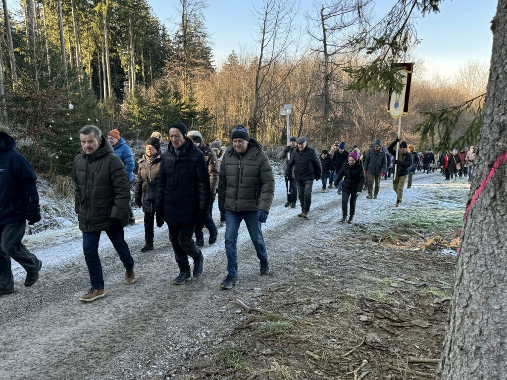 Als sich die große Pilgerschar nach der Festmesse betend und singend hinauf zur Sebastianskapelle auf den Weg machte, herrschte eitel Sonnenschein bei Temperaturen knapp unter 0 Grad.. Der stete Anstieg ist durchaus beschwerlich, aber auffallend viele ältere Menschen meisterten diese Herausforderung ganz gut, darunter auch der 94-jährige Hermann Kemmler. „Die Wallfahrt ist für mich Pflicht“, meinte der treue Mitpilgernde. Die Wegstrecke war mit Kies rechtzeitig bestreut worden, da sich der Schneebelag im Waldbereich doch teilweise  in Eis verwandelt hatte. Oben erstrahlte die Kapelle im hellem Sonnenlicht unter blauem Himmel,  umgeben vom prachtvollen winterlichen Fichtenwald.