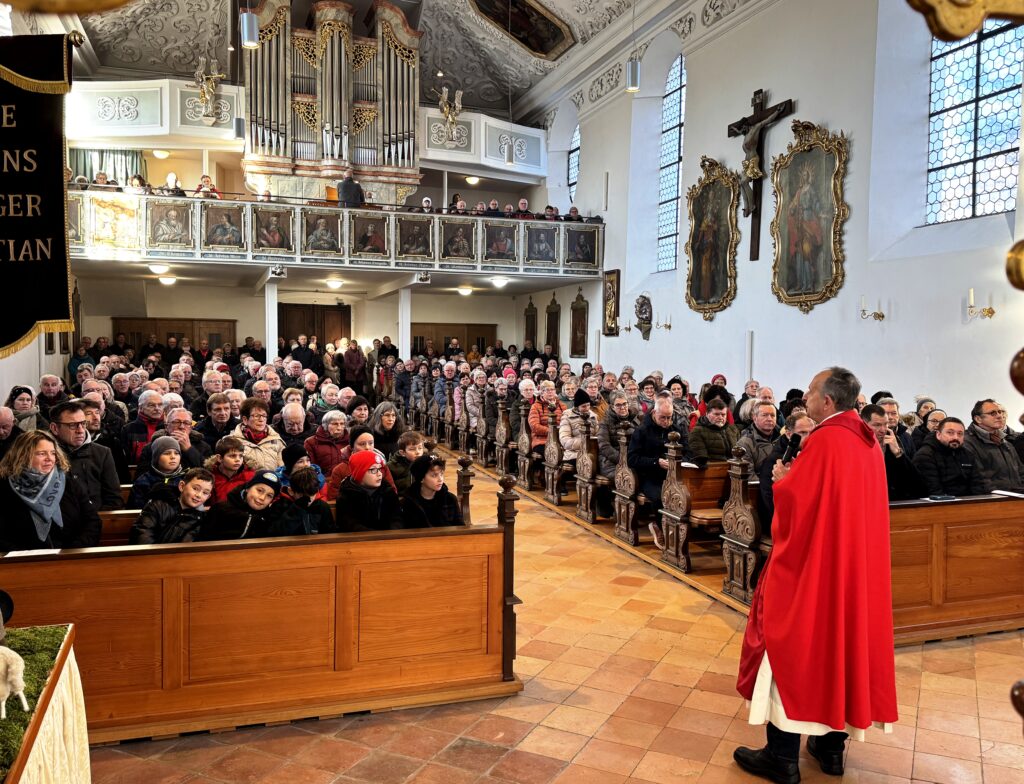 Haisterkirch – Wie eh und je am Sebastianstag kamen Hunderte von Gläubigen am 20. Januar  aus nah und fern nach Haisterkirch. Am Gedenktag des hl. Sebastian wird traditionsgemäß um 9.00 Uhr in der Pfarrkirche Haisterkirch ein Festgottesdienst angeboten mit anschließender Prozession hinauf zur Kapelle St. Sebastian. Im Volksmund wird diese auch „Bastiane- oder Baschtiane-Kapelle“ genannt. Die  Pfarrkirche war deutlich vor Gottesdienstbeginn schon voll belegt.