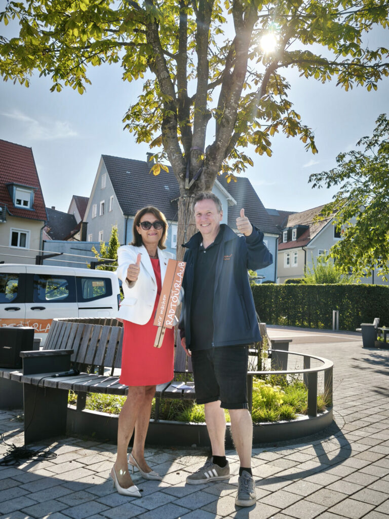 Bürgermeisterin Monika Ludy (hier mit Dieter Krumme, Gesamtleiter von radtourlaub.de) stellte den Radlern die Stadt Bad Waldsee vor. Foto: Heiko Stein.