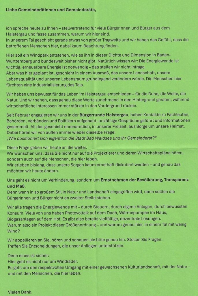 Konkretes konnte Karl Merk hier nicht mehr anbieten außer den Zitaten eines Gespräches mit Herrn Van der Valk, Betreiber einer psychiatrischen und psychosomatischen Klinik in Bad Waldsee, der vor den Fallstricken in den Verträgen, bewusst herbeigeführten Insolvenzen bei den Betreibern zu Lasten der Grundstückseigentümern und vor dem Rückgang des Reha- und Freizeittourismus in Bad Waldsee durch die Windkraftanlagen warnte.