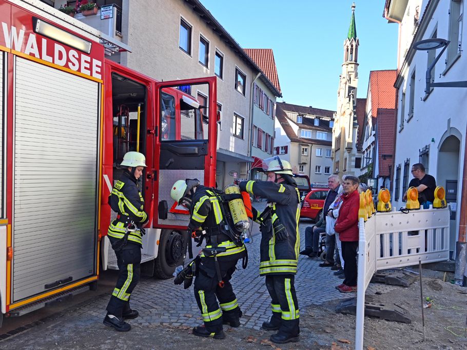 Qualm drang aus einem Fenster des Neuen Rathauses. Ein Verletzter hatte sich auf das Baugerüst gerettet. So sah das Einsatzszenario für die Bad Waldseer Wehr aus.
