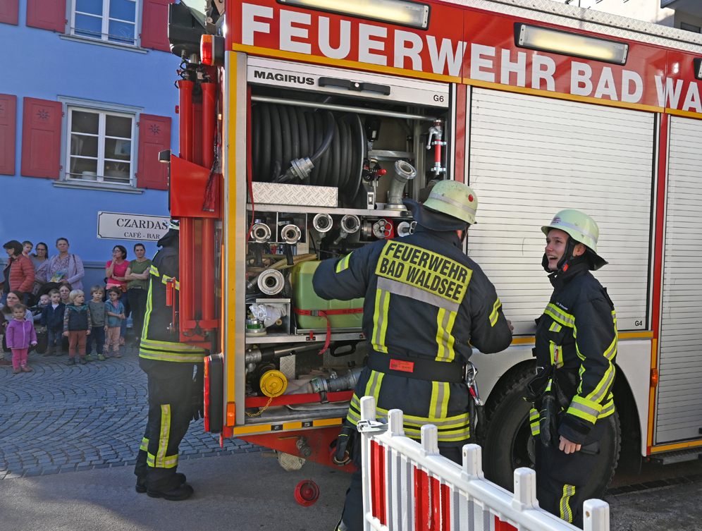 Die aktiven Wehrmänner und jene Uniformträger, die heute (21.10.) nicht im Einsatz waren, sowie der Spielmannszug formieren sich hinter der Fahne zum Appell. Markig befiehlt der Bad Waldseer Kommandant Alois Burkhardt: „Augen, geradeaus!“ Die Wehrmänner stehen stramm vor ihrem Dienstherrn Oberbürgermeister Henne. Wie immer findet der die richtigen, lobenden Worte für „seine“ Wehr. „Ihr habt eine wunderbare Leistung abgeliefert und gezeigt, dass die Lehrgänge und die vielen Übungsstunden auch in die Praxis umgesetzt werden können.“ Dafür bedanke er sich im Namen der Bevölkerung und des Gemeinderates und er versprach auch in Zukunft den Rückhalt des Rates, wenn neues Gerät notwendig würde.