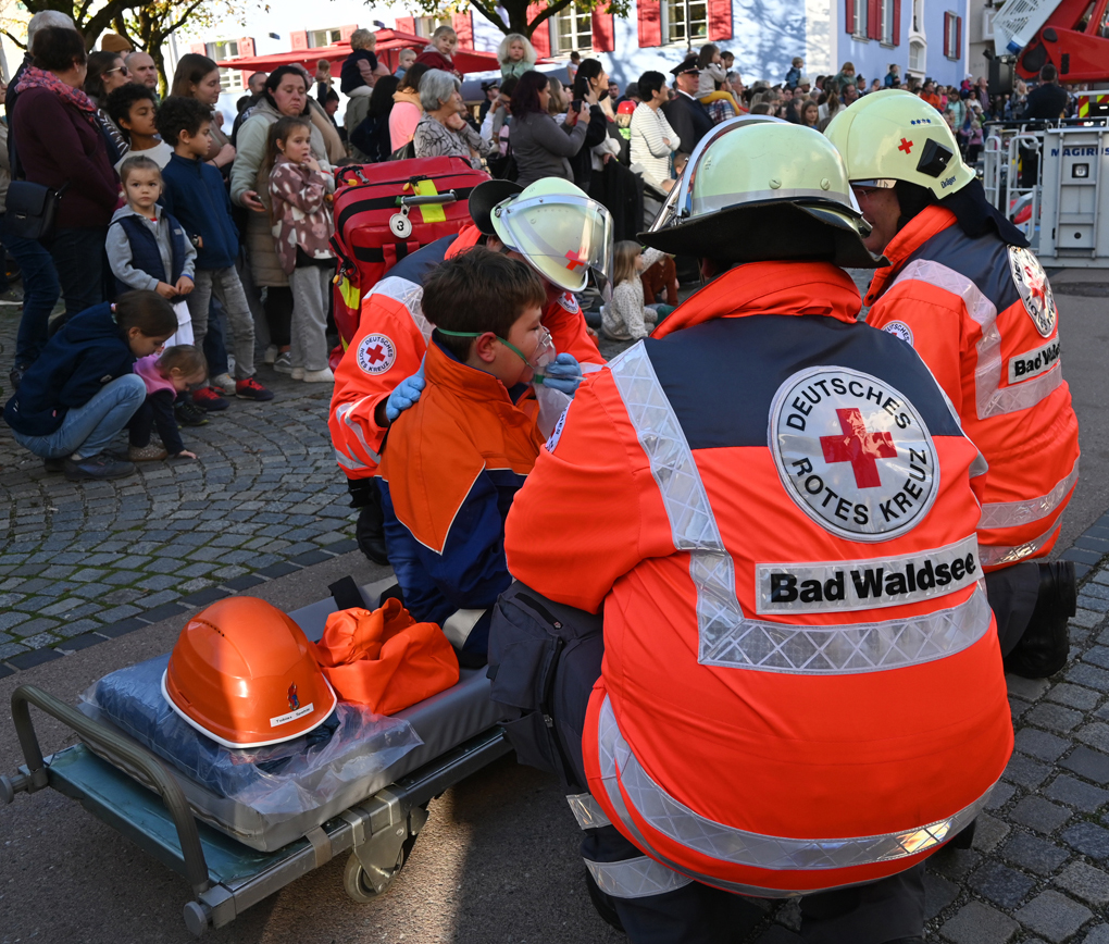 Es waren noch keine fünf Minuten vergangen. Zwei Mann mit Spezial-Kletterausrüstung enterten das Baugerüst. „Da haben sich die Waldseer eine knifflige Situation rausgesucht“, kommentierte Oliver Surbeck, Kreisbrandmeister und extra für den Kirbemontag nach Bad Waldsee gekommen. „Jetzt kann die neu aufgebaute Abteilung der Höhenretter endlich mal zeigen, was in ihr steckt. Die Abteilung in Bad Waldsee aufzubauen war wichtig und richtig, denn bis die nächste Spezialabteilung aus dem Schussental anrücken kann, braucht’s doch mindestens 20 Minuten.“