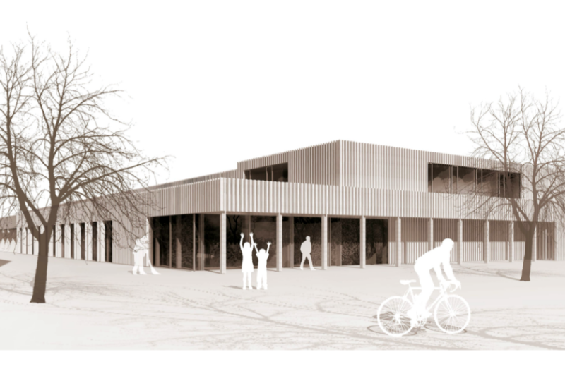 Der Bau tritt nach innen und außen als Holzwerk in Erscheinung und passt sich somit auch an den geplanten Ausbau des Gymnasiums an. Auch die CO2-Emissionen werden durch den Lebenszyklus des Holzbaus reduziert. Für das Dach sind aufgeständerte PV-Module mit durchlaufender Dachbegrünung vorgesehen. Die Halle erhält Licht durch eine großzügige Verglasung der Nordfassade. Die Südfassade wird mit Oberlichtbändern und integriertem Sonnenschutz ausgestattet.