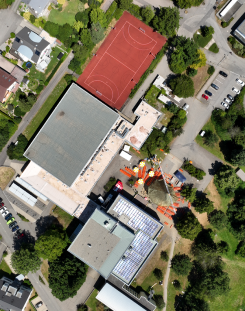 Im Bereich des roten Spielfeldes wird der Anbau an die bestehende Sporhalle (grau) realisiert werden. Das Luftbild wurde den Sitzungsunterlagen entnommen.