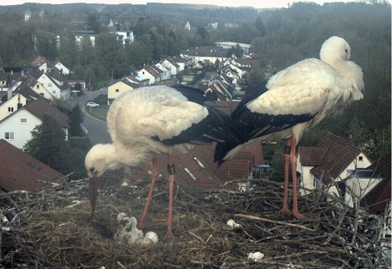 Alle Storchennester in Bad Waldsees Teilorten sind wieder von denselben Störchen wie 2023 besetzt. Sieglinde und Siegfried haben auf dem Brauereikamin als Erste zu brüten begonnen. Die volle Eieranzahl von sechs Eiern war auf der Webcam zu sehen. Am Donnerstag, 25. April, schlüpften sechs Storchenküken. Dass alle sechs Jungstörche ausfliegen, ist sehr unwahrscheinlich. Dies hängt vom Wetter ab und damit vom Nahrungsangebot. Da es viele Milane gibt, muss eines der Elterntiere die ersten Wochen bei den Jungen bleiben. Auch Störrungen durch Artgenossen erhöhen den Stress für die Storcheneltern. Die Störche legen genügend Eier, da eine zweite Brut viel Aufwand ist. Spätestmöglicher Brutbeginn bei Störchen ist der 15. Mai.
