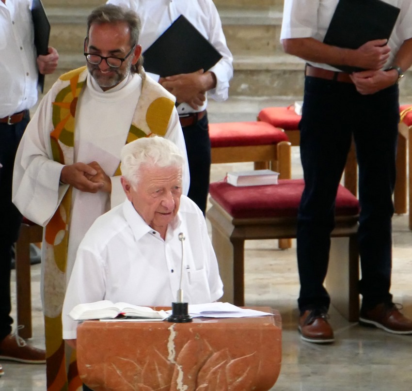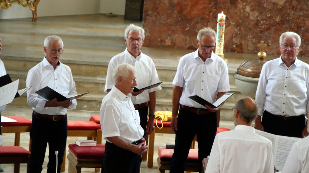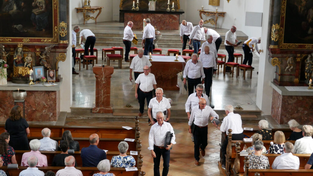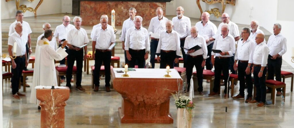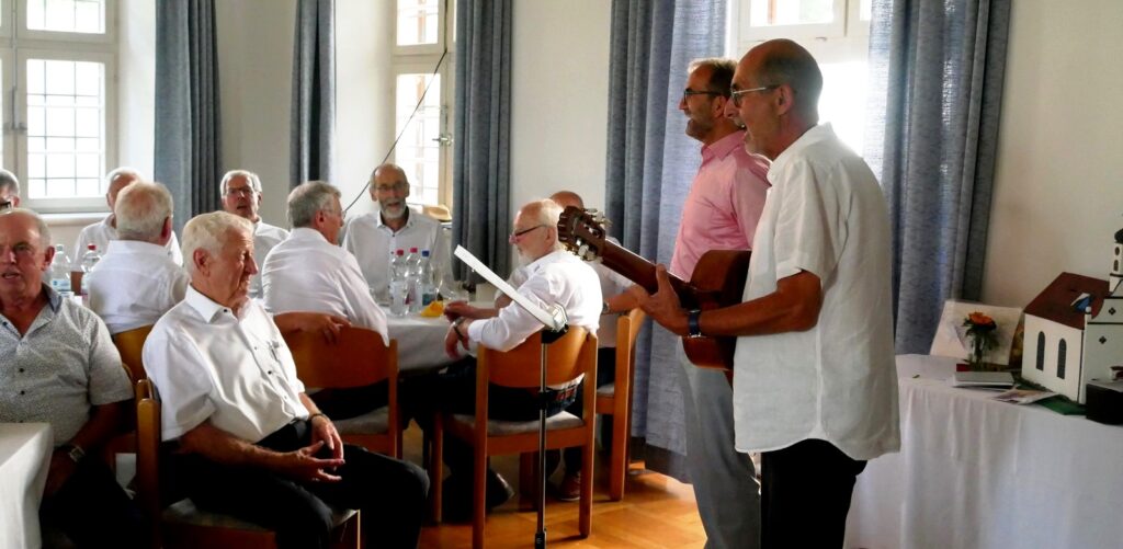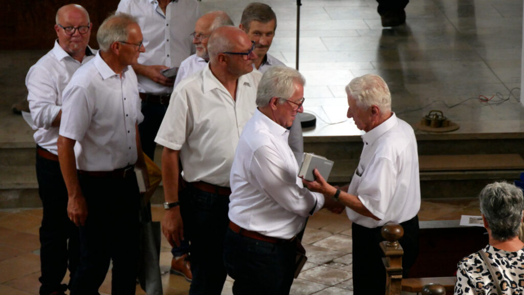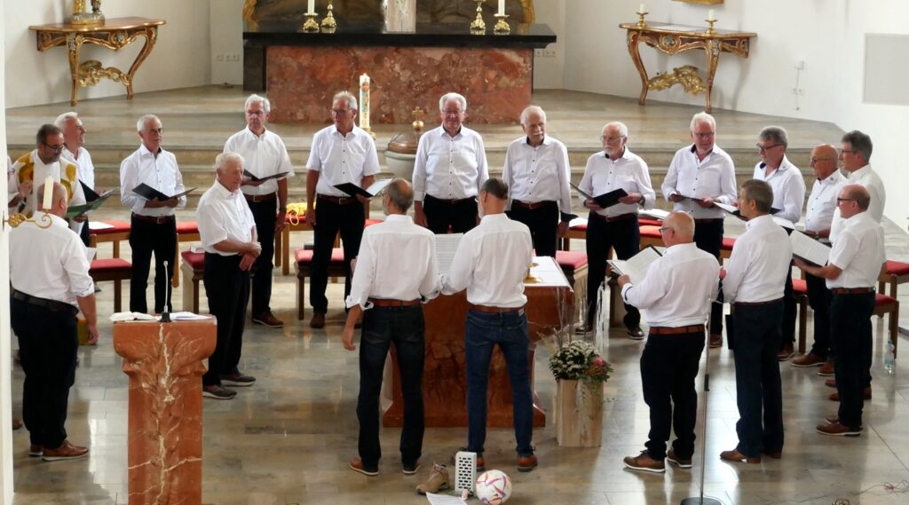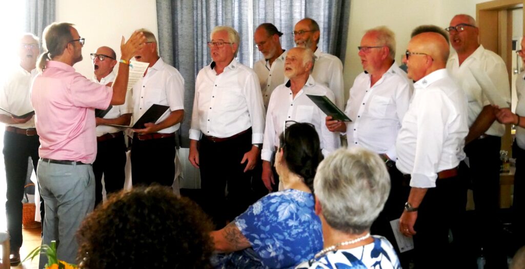 Sozusagen für die Überraschung des Tages und für den Jubilar sorgte Pfarrer Stefan Werner mit einer Dankesandacht am frühen Nachmittag in der Kirche. Er erwähnte dabei auch, dass Erwin Kübler zu den ganz treuen Gottesdienstbesuchern zählt. Eingeladen zur Andacht waren alle MCH-Sänger, die keine Arbeitsverpflichtung hatten und die sich bei zwei Proben unter Leitung von Stefan Werner passendes Liedgut angeeignet hatten. Gekommen waren neben den Verwandten, Nachbarn auch die Teilnehmer der Wandergruppe Kübler, die sich wöchentlich jeweils donnerstags auf die Wege begeben in heimatlichen Gefilden. Für die festlichen Orgel- und Posaunenklänge sorgten musikalisch Begabte aus dem jüngeren Verwandtenkreis. Pfarrer Stefan Werner und seine 20 Sangeskameraden wussten mit Inbrunst und stimmgewaltig das ausgesuchte Liedgut vorzutragen. Wobei das Lied „Du bist gesegnet, ein Segen bist Du“, auch Leitmotiv für die Ansprache von Stefan Werner war. Überaus aufklärend und voll zutreffend waren die Dankesworte von zwei Nichten des Jubilars. Die Beiden zeigten anhand von symbolischen Utensilien wie Wanderschuh, Fußball, Ziegelstein, Notenblatt auf, weshalb Onkel Erwin ein Segen für so viele Menschen war und ist.
