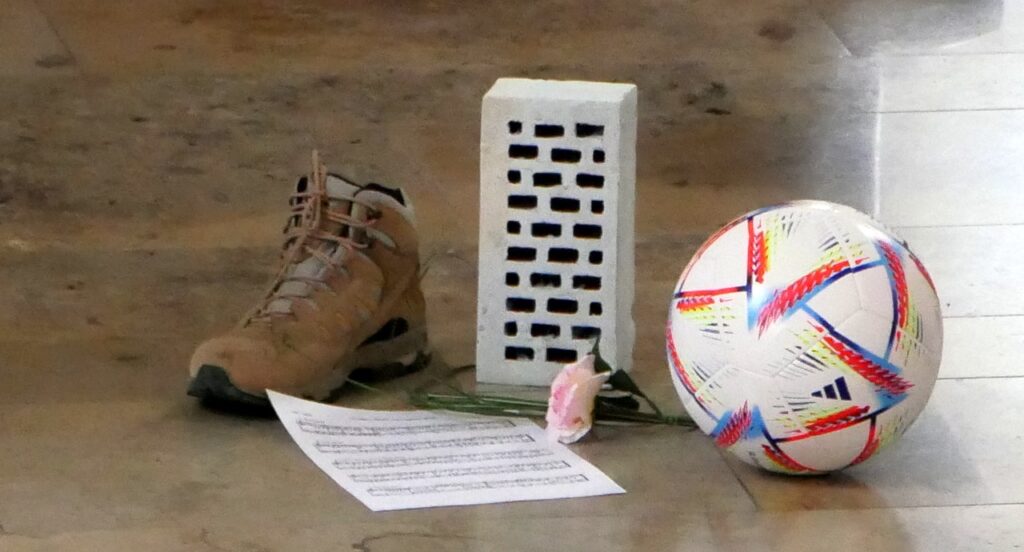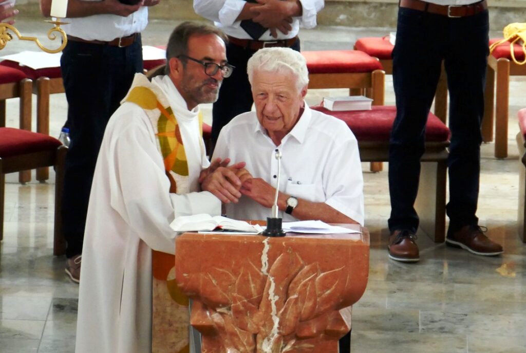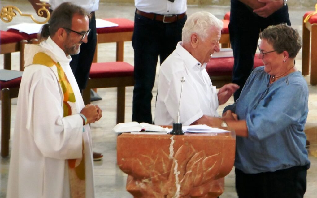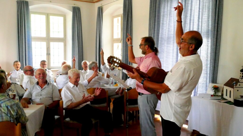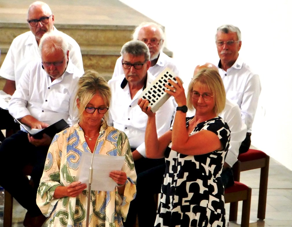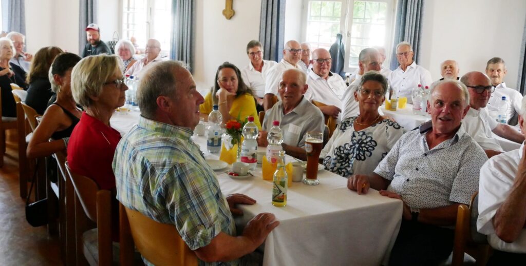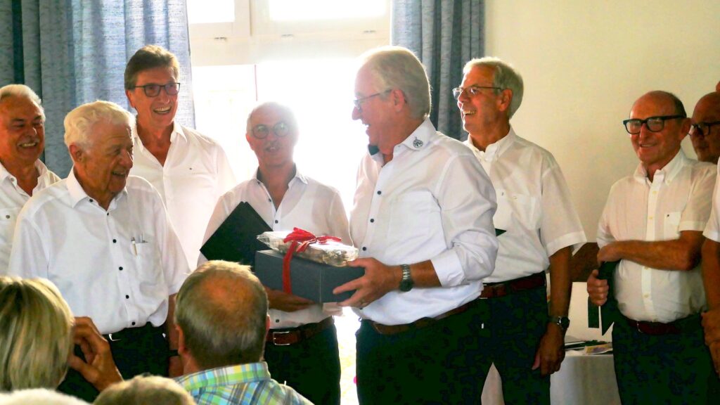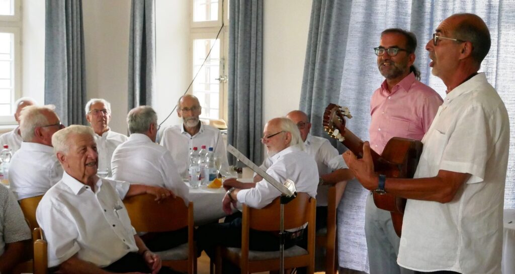 Sozusagen für die Überraschung des Tages und für den Jubilar sorgte Pfarrer Stefan Werner mit einer Dankesandacht am frühen Nachmittag in der Kirche. Er erwähnte dabei auch, dass Erwin Kübler zu den ganz treuen Gottesdienstbesuchern zählt. Eingeladen zur Andacht waren alle MCH-Sänger, die keine Arbeitsverpflichtung hatten und die sich bei zwei Proben unter Leitung von Stefan Werner passendes Liedgut angeeignet hatten. Gekommen waren neben den Verwandten, Nachbarn auch die Teilnehmer der Wandergruppe Kübler, die sich wöchentlich jeweils donnerstags auf die Wege begeben in heimatlichen Gefilden. Für die festlichen Orgel- und Posaunenklänge sorgten musikalisch Begabte aus dem jüngeren Verwandtenkreis. Pfarrer Stefan Werner und seine 20 Sangeskameraden wussten mit Inbrunst und stimmgewaltig das ausgesuchte Liedgut vorzutragen. Wobei das Lied „Du bist gesegnet, ein Segen bist Du“, auch Leitmotiv für die Ansprache von Stefan Werner war. Überaus aufklärend und voll zutreffend waren die Dankesworte von zwei Nichten des Jubilars. Die Beiden zeigten anhand von symbolischen Utensilien wie Wanderschuh, Fußball, Ziegelstein, Notenblatt auf, weshalb Onkel Erwin ein Segen für so viele Menschen war und ist.